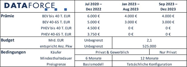 - Ab September 2023 können mit wenigen Ausnahmen nur noch Privatkäufer die Prämie beantragen. Für Dienstwagen gibt es dann nur noch die geringere Besteuerung des geldwerten Vorteils bei Nutzung eines BEVs oder PHEVs.