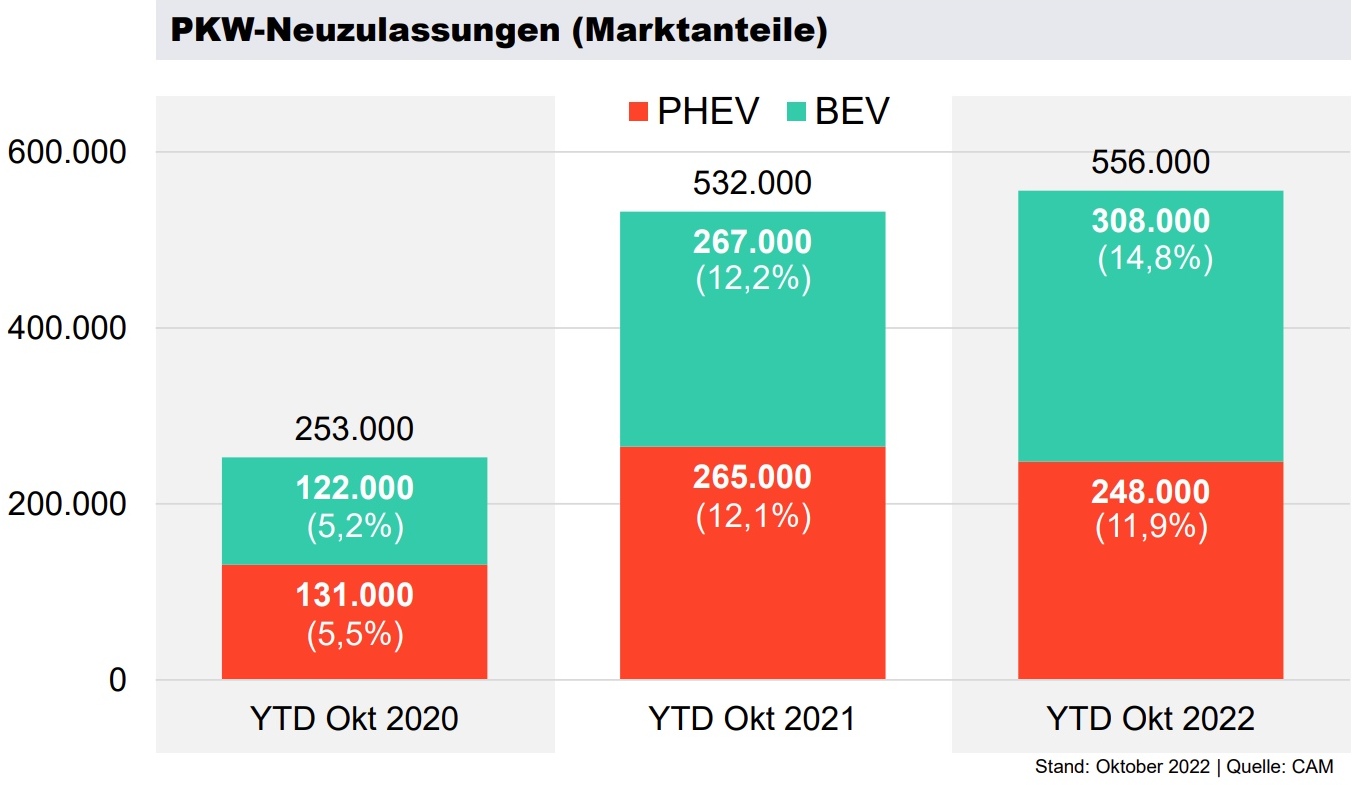 Eine umfangreiche Marktstudie von YouGov in Kooperation mit dem Center of Automotive Management (CAM) liefert spannende Ergebnisse zu Elektromobilität und reinen Elektroautos (BEV) in Deutschland. Das Marktwachstum der Elektromobilität setzt sich in Deutschland dynamisch fort. Einschließlich September 2022 wurden in Deutschland 556.000 Elektrofahrzeuge (BEV, PHEV) abgesetzt.