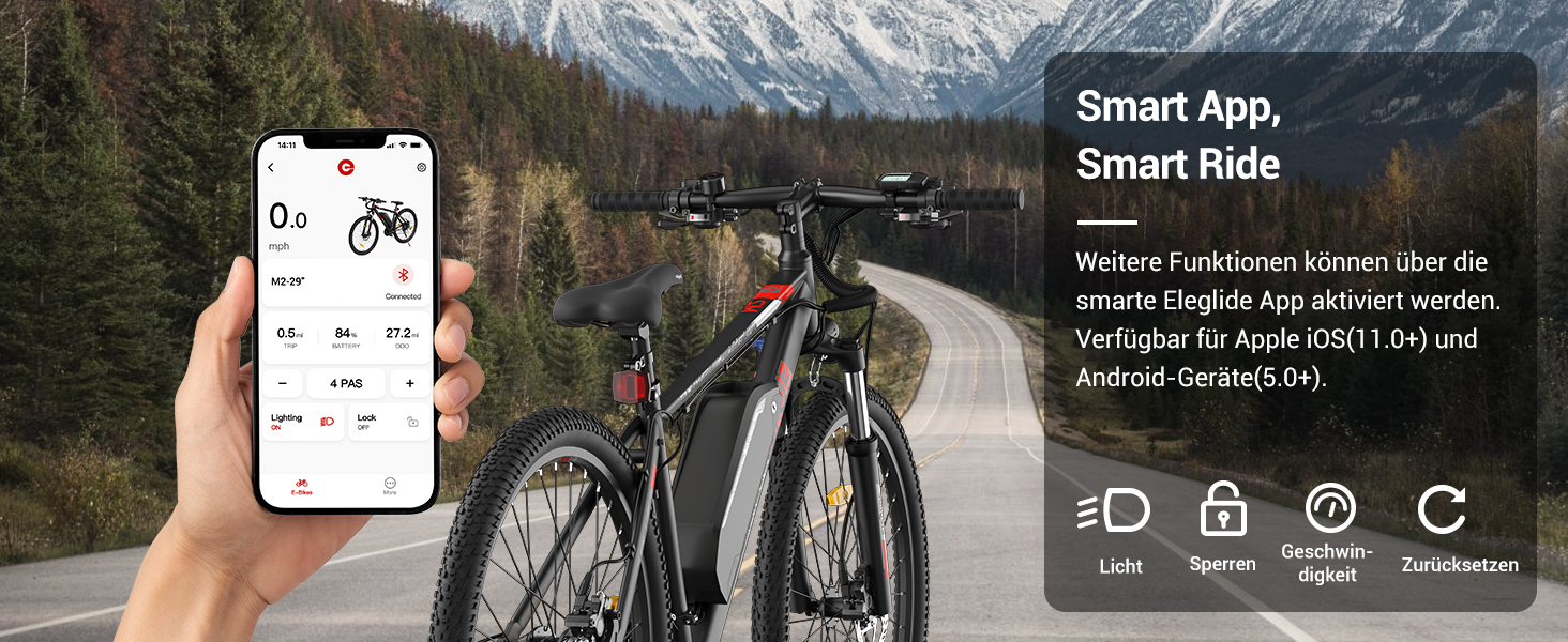 Am Lenker informiert eine LCD-Anzeige über wichtige Fahrdaten wie die aktuelle Geschwindigkeit, die zurückgelegte Strecke und die verbleibende Batterieleistung. Viele weitere Details lassen sich über die Eleglide App am Smartphone einsehen. Diese ermöglicht zudem weitere Funktionen wie das Sperren des Fahrrads als Diebstahlschutz.
