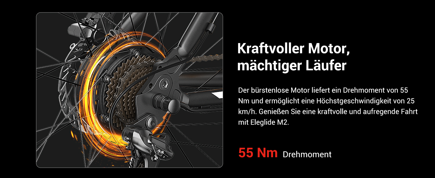 Trotz seines aktuell besonders günstigen Preises von nur 769 Euro bietet das Eleglide M2 eine beeindruckende Ausstattung. Der 250 Watt starke Motor in der Hinterradnabe des E-Mountainbikes verwandelt mit seinen stolzen 55 Nm Drehmoment auch steile Anstiege gefühlt in Flachland und unterstützt bis 25 km/h kraftvoll die eigene Tretleistung.