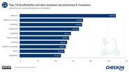 Bei Check24 wird der größte Anteil versicherter E-Roller in Kleinstädten mit weniger als 20.000 Einwohnern (32 Prozent) registriert. Ein ähnlich großer Anteil entfällt auf Städte mit 20.000 bis 100.000 Einwohnern (31 Prozent). In den Großstädten mit mehr als 100.000 Einwohnern finden sich 26 Prozent der über Check24 versicherten E-Scooter. In Metropolen mit über einer Million Einwohnern sind es noch 11 Prozent.