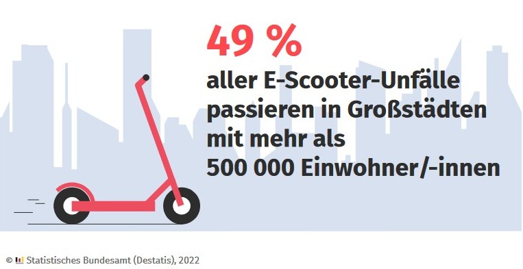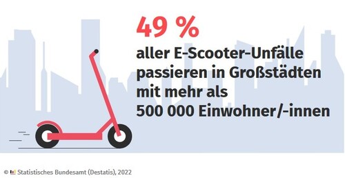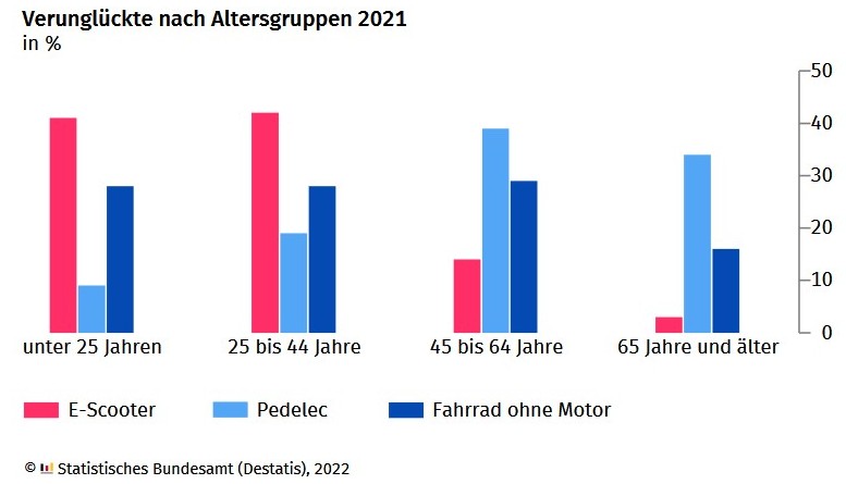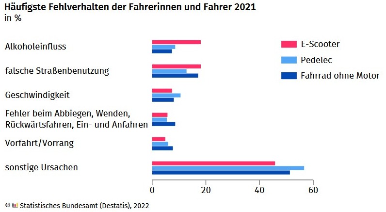 Am 7. Juli 2022 hat das Statistische Bundesamt die Ergebnisse der Straßenverkehrsunfallstatistik für das Jahr 2021 vorgestellt. Im Fokus: das Unfallgeschehen von E-Bikes (Pedelecs) und E-Scooter. Im Jahr 2021 wurden in Deutschland 4 882 Menschen, die mit dem E-Scooter unterwegs waren, verletzt und fünf starben. Häufigste Unfallursachen: Alkoholeinfluss und falsche Straßenbenutzung.