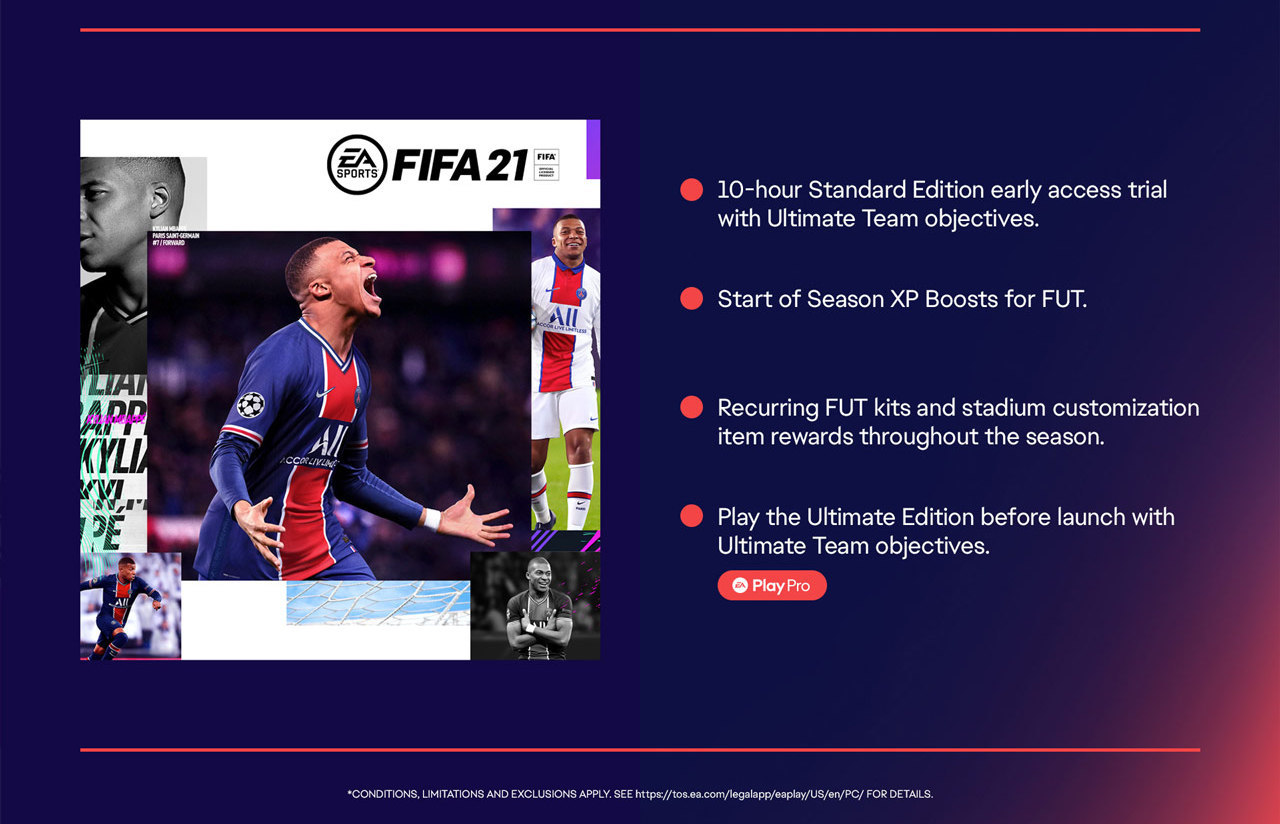 - FIFA 21-Spieler erhalten bereits am 1. Oktober Zugriff auf die Trial-Version, die Vorab-Herausforderungen zur Freischaltung exklusiver Belohnungen enthält, sowie die ganze Saison lang zusätzliche Vorteile, einschließlich FIFA Ultimate Team-Saisonziel-EP-Boosts.