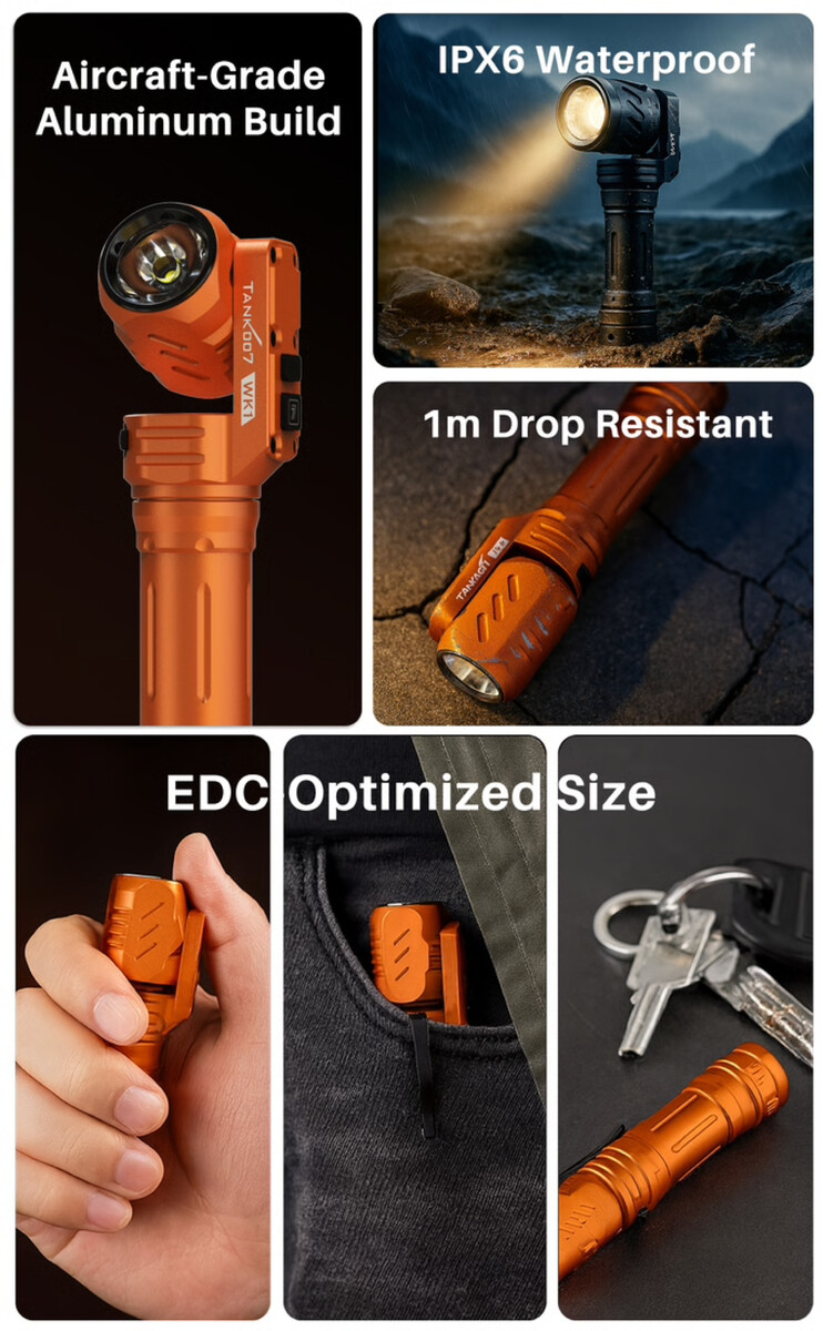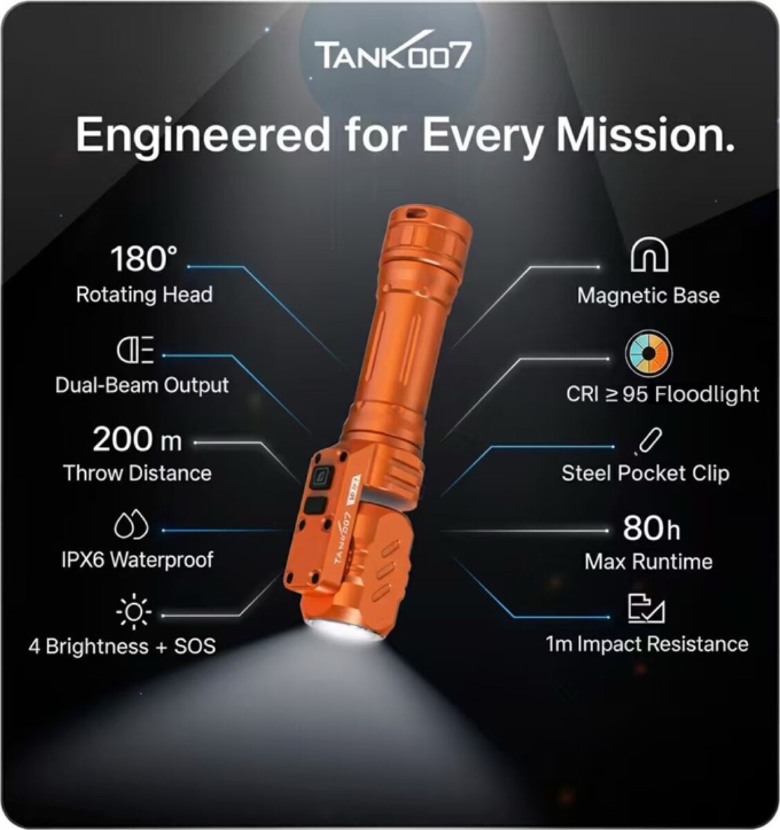 Die Tank007 WK1 setzt auf ein ungewöhnliches Gehäuse aus Aluminium, das nach IPX6 zertifiziert und somit gegen Regen geschützt ist, und das es erlaubt, den Kopf der Lampe um 180 Grad zu drehen. So kann die Lampe nicht nur ergonomischer gehalten werden, es ist auch möglich, die WK1 durch die magnetische Basis an einem Metall-Schrank oder einem magnetischen Tisch zu befestigen.