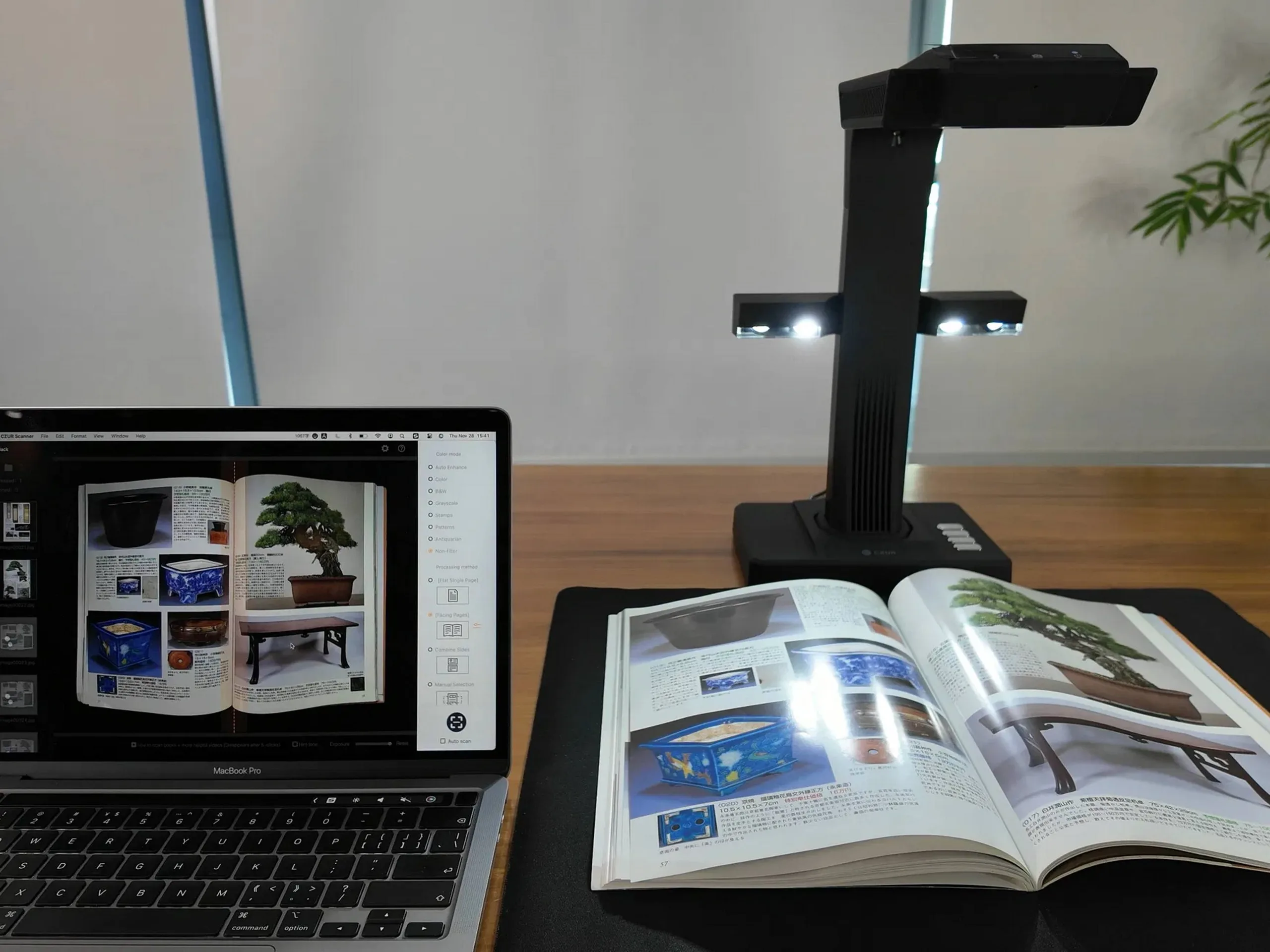 Das System bietet eine Kamera mit einer Auflösung von 7.168 x 5.376 Pixeln und 410 DPI, im Grunde werden JPG-Dateien aufgenommen, der Export ist aber auch als PDF möglich. Die Farbtiefe gibt das Unternehmen mit 24 Bit an. Es stehen LEDs bereit - das ist nicht nur für eine gute Ausleuchtung und damit Sichtbarkeit nötig, mit einer speziell positionierten Beleuchtung sollen sich auch glänzende Dokumente wie etwa Broschüren mit hoher Qualität und ohne Überblendung scannen lassen. Beworben werden ganz verschiedene Techniken, welche das Scannen einfach und effizient machen sollen. So müssen etwa Bücher nicht stark auseinandergezogen werden, die Krümmung wird stattdessen herausgerechnet. Für die Steuerung ist auch ein Pedal nutzbar, was Scanvorgänge ebenfalls rationalisieren soll. Verschiedene, kleinere Dokumente können gleichzeitig gescannt werden, dank eines HDMI-Ausgangs ist die Nutzung auch als Presenter möglich - und zwar sogar mit 4K-Auflösung und 30 Hz.