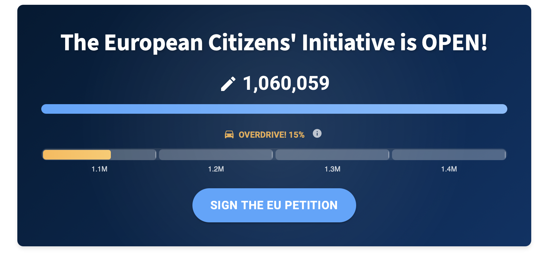 Die Initiatoren weisen übrigens darauf hin, dass noch mehr Unterschriften nicht schaden können, für den Fall, dass ungültige Unterschriften dabei sind. Ein bisschen Reserve würde dem Projekt helfen. Ob und in welchem Maße die EU nun reagieren wird, wird sich in den nächsten Monaten und Jahren zeigen.