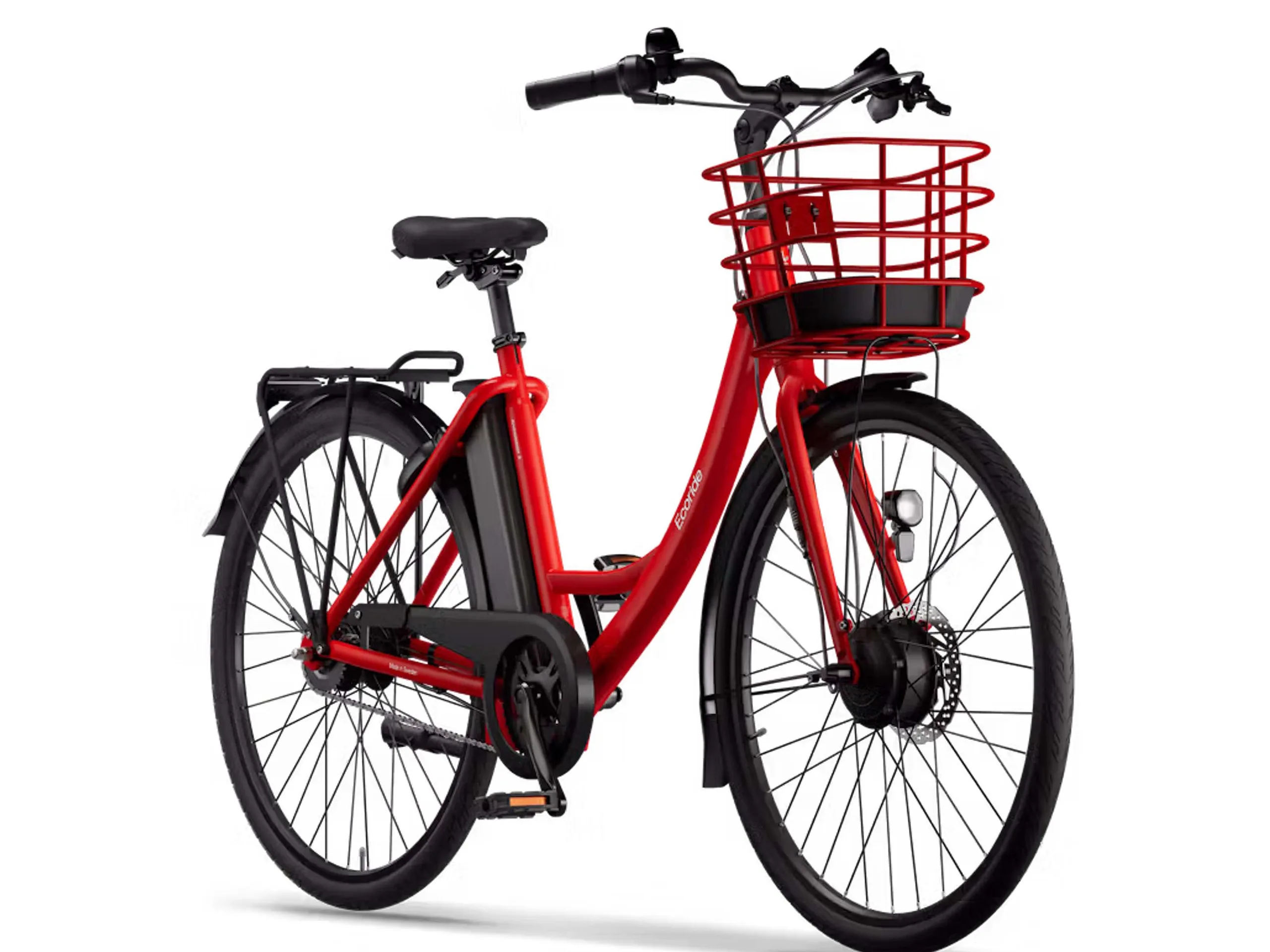 Vorne und hinten sind Kenda K1088-Reifen aufgezogen. Die Kraftübertragung erfolgt klassisch mithilfe einer Fahrradkette, wobei eine Nabenschaltung genutzt wird. Diese bietet sieben Gänge. Eher ungewöhnlich ist das Bremssystem: So verzichtet Ecoride hinten auf eine Scheibenbremse, stattdessen wird ein Rücktritt genutzt. Ein solcher belastet den Antrieb relativ stark, die Nutzbarkeit ist zudem abhängig von der Pedalstellung. Vorne kommt eine Scheibenbremsen mit einer 160 Millimeter großen Bremsscheibe zum Einsatz.