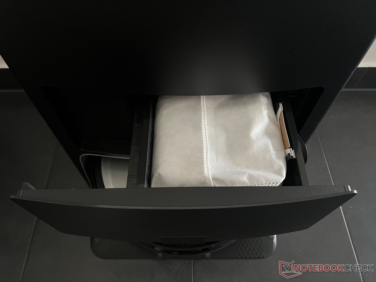 Unter den Wassertanks sitzt in einer Schublade der Staubsammelbehälter mit dem 3 Liter großen Beutel. Hier hinein saugt die Station automatisch den aufgesaugten Dreck aus dem 400 ml fassenden Staubbehälters im Roboter. Somit muss dieser nicht mehr manuell geleert werden, kann es aber natürlich auch weiterhin noch.