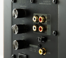 Die Boxen sind sehr solide gebaut und bringen es auf ein Gewicht von 8 Kilogramm pro Box. Auch das Design wirkt dank einer Kombination von mattschwarzem Schleiflack und seitlichen Holzapplikationen sehr hochwertig. Hinsichtlich der Anschlüsse gibt sich das Edifier S1000DB extrem kontaktfreudig. Neben zwei RCA-Eingängen, je einmal AUX und PC, bietet das Soundsystem auch noch jeweils einen optischen und einen koaxialen digitalen Eingang. Zusätzlich verfügt das Edifier S1000DB noch über ein integriertes Bluetooth-Modul, das drahtloses Streaming von mobilen Endgeräten (aptX-Protokoll) ermöglicht.