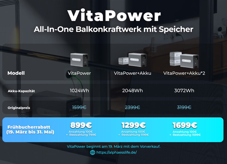 Zum Start von VitaPower offeriert Alpha ESS eine spannende Rabattaktion. Wer in dessen Rahmen vorab 100 Euro anzahlt, profitiert vom Frühbucherpreis in Höhe von nur 899 Euro. Zudem bekommen die ersten 500 Kunden einen intelligenten Smart-Plug-in mit Wert von 39,99 Euro geschenkt. Nähere Informationen zu der Aktion, den Bedingungen sowie VitaPower im Allgemeinen liefert die Webseite des Herstellers.