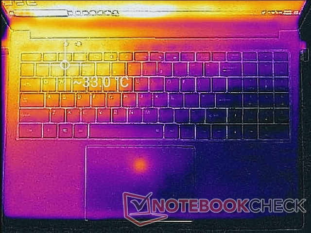 (+) Die Handballen und der Touchpad-Bereich erreichen maximal 33.6 °C und damit die typische Hauttemperatur und fühlen sich daher nicht heiß an.