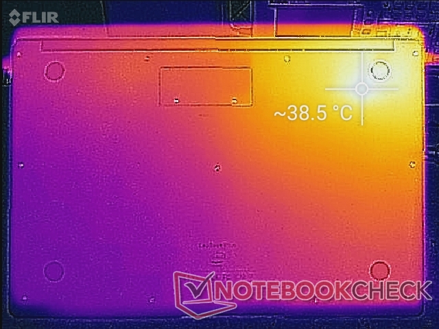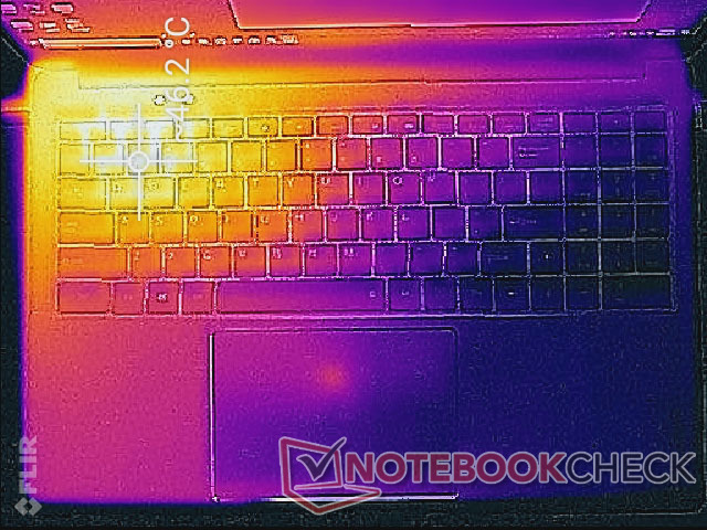 Die Oberflächentemperaturen sind im Bereich um die Handballenauflagen, das Clickpad und den Großteil der Tastatur kühl. Die wärmsten Stellen, die bei dauerhaft hoher Prozessorauslastung mehr als 50 °C erreichen können, befinden sich in derselben Ecke wie die passiv gekühlte CPU.