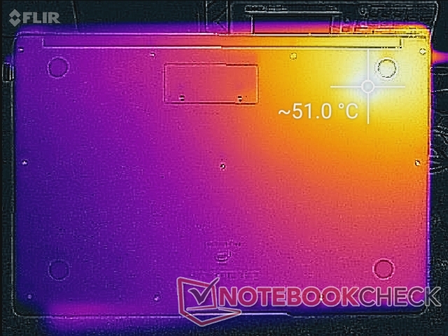 (-) Auf der Unterseite messen wir eine maximalen Wert von 51 °C (im Vergleich zum Durchschnitt von 39.2 °C).