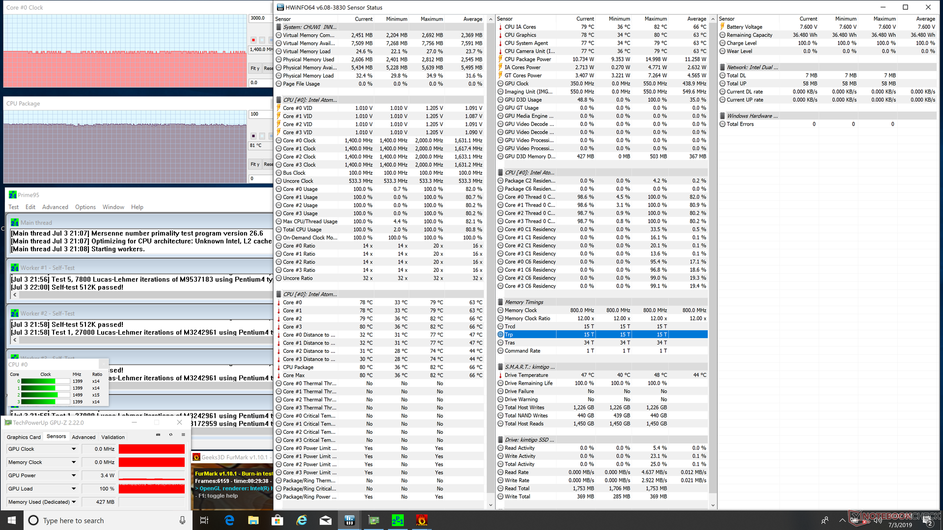 Um den Laptop auf potenzielles Drosseln und mögliche Stabilitätsprobleme zu überprüfen, lasten wir ihn künstlich aus. Beim Ausführen von Prime95 springt der CPU-Takt in den ersten paar Sekunden auf 1,9 GHz, fällt dann ab und stabilisiert sich schließlich bei 1,6 GHz. Die Kerntemperatur pendelt sich bei 100-prozentiger Auslastung bei ca. 81 °C ein.
