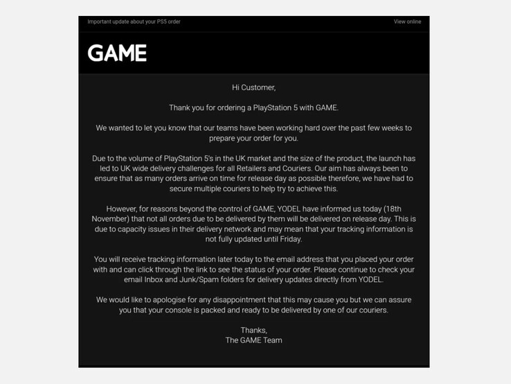 Der britische Händler Game hat die unten eingebettete Nachricht an Kunden geschickt, die trotz Vorbestellung heute keine PlayStation 5 erhalten haben. Demnach stellt nicht nur die hohe Anzahl der vorbestellten Konsolen, sondern vor allem auch die schiere Größe der PlayStation 5 die Logistik vor eine immense Herausforderung, und zwar unabhängig davon, bei welchem Händler man bestellt habe oder welcher Paketdienst die Konsole transportiert.