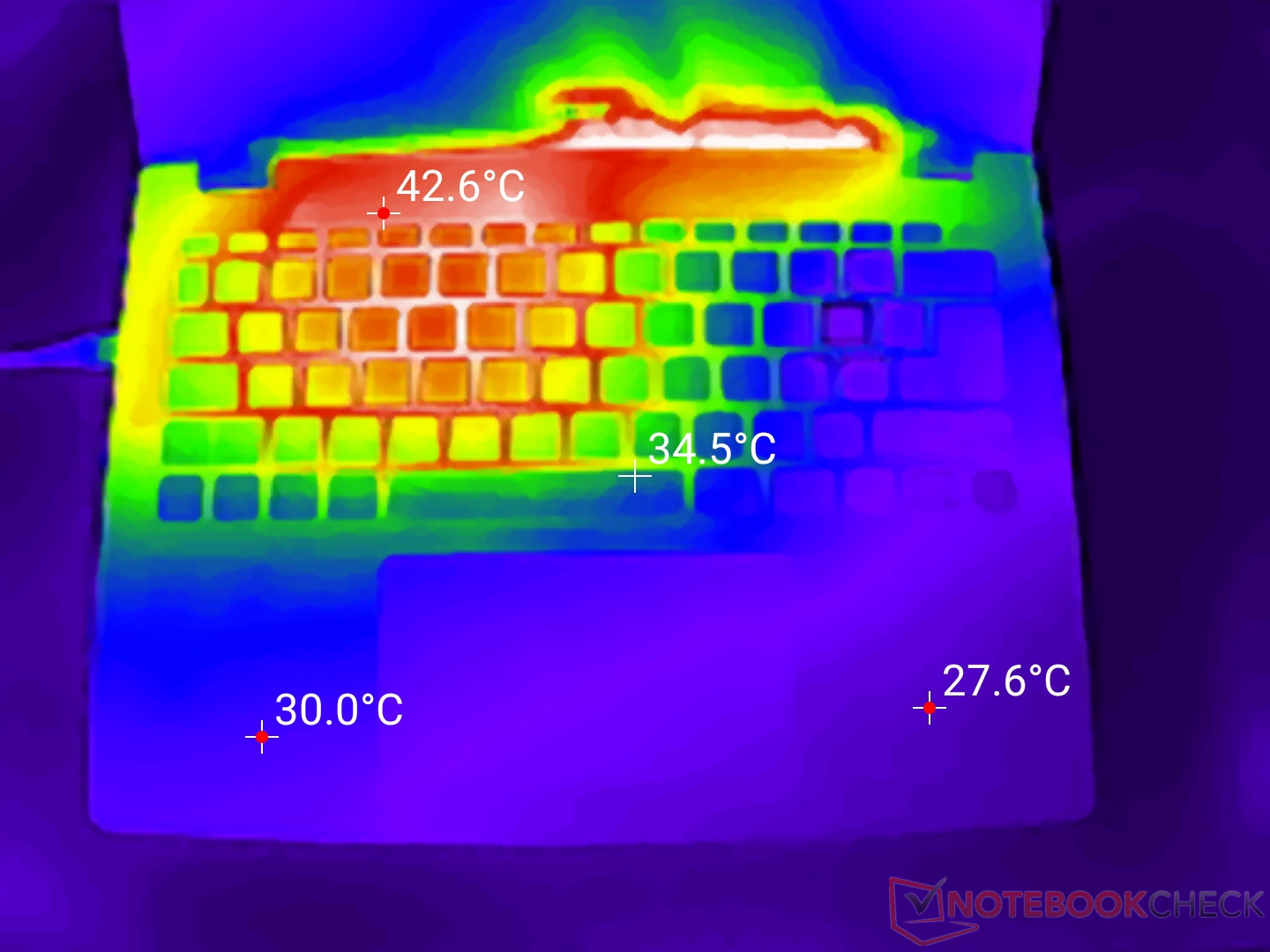 (+) Die Handballen und der Touchpad-Bereich sind mit gemessenen 30.1 °C kühler als die typische Hauttemperatur und fühlen sich dadurch kühl an.