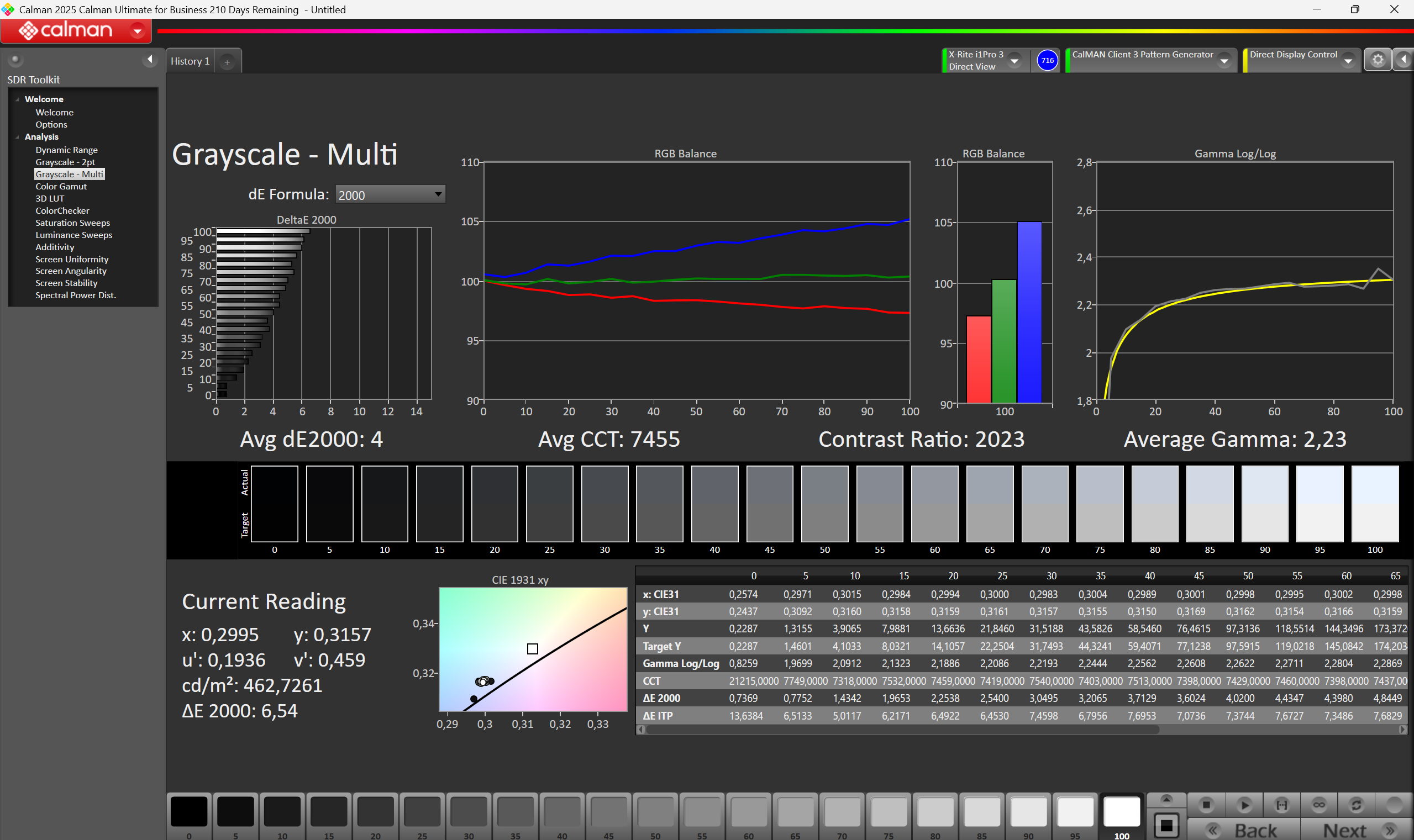 | Delta E Graustufen * | 4.9 | 1.1 78% | 4.7 4% | 9.2 -88% | 5.7 -16% | 2.3 53% |