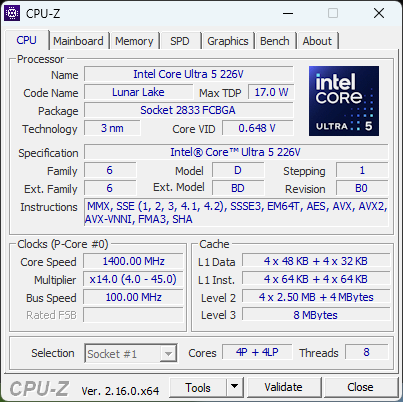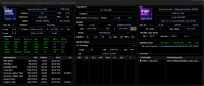 Das Herzstück des Notebooks ist die neue "Lunar Lake" Plattform von Intel. Im Testgerät arbeitet ein Intel Core Ultra 5 226V. Eine Besonderheit dieser Architektur ist der Arbeitsspeicher, der direkt mit auf dem Prozessor-Package integriert ist (On-Package-Memory). Das sorgt für sehr kurze Zugriffszeiten und eine hohe Energieeffizienz. Die hier verbauten 16 GB sind für alltägliche Büroarbeiten und die meisten anspruchsvolleren Programme ausreichend. Für intensive, lokal ausgeführte KI-Anwendungen, die stark vom Arbeitsspeicher profitieren, könnte es aber knapp werden. Die Grafikausgabe übernimmt die integrierte Intel Arc Graphics 130V.