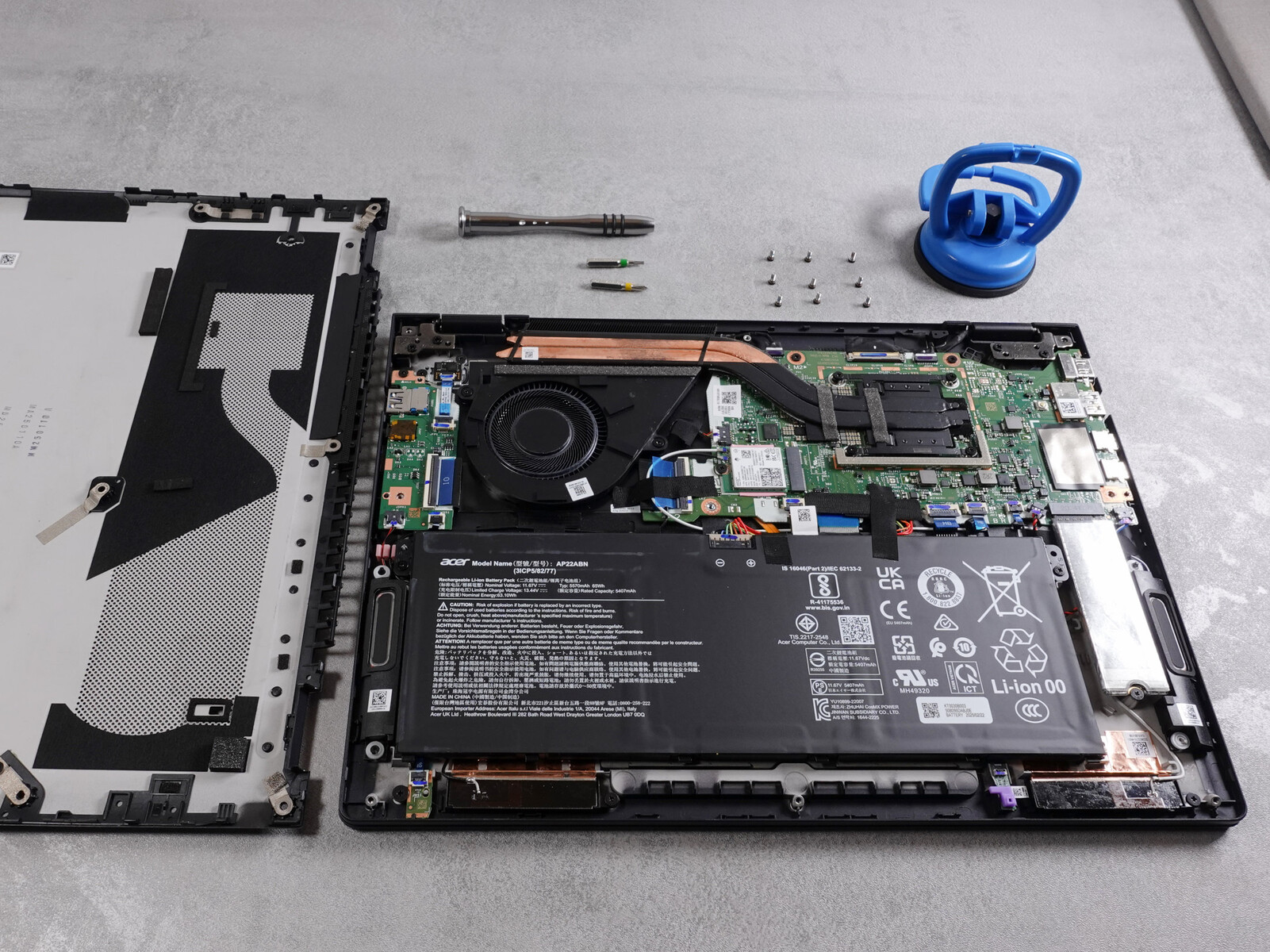 Auch beim Thema Nachhaltigkeit zeigt sich das TravelMate P6 durchdacht. Ein praktisches Detail für eine lange Nutzungsdauer ist die Service-Öffnung an der Unterseite. Durch diese kann der Lüfter einfach mit Pressluft gereinigt werden, ohne das Gehäuse dafür öffnen zu müssen. Alle sechs Betriebsstunden wird der Luftstrom des Laptops zudem kurz umgekehrt, um die Kühlrippen möglichst lange staubfrei zu halten.