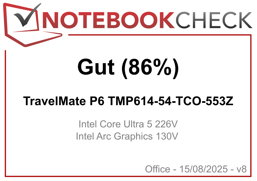 | Acer TravelMate P6 TMP614-54-TCO-553Z Intel Core Ultra 5 226V ⎘ Intel Arc Graphics 130V ⎘ 16 GB RAM, 512 GB SSD | Amazon: Bestpreis 1337.93€ electronis.de 2. 1337.94€ playox.de 3. 1337.95€ galaxus | 1 kg | 17 mm | 14.00" 1920x1200 162 PPI IPS | |