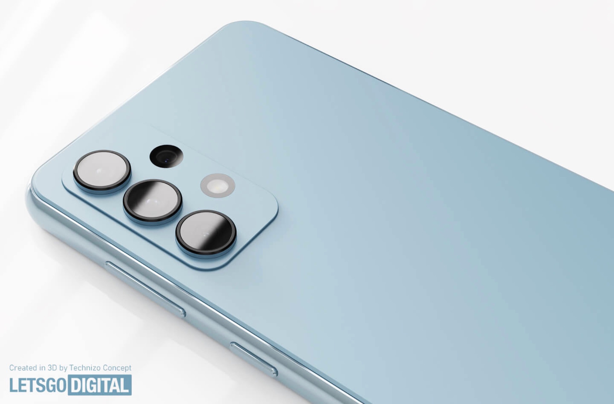 Der Designer geht davon aus, dass die Punch-Hole-Frontkamera in der Mitte beibehalten wird, genau wie die abgerundeten Kanten. Das Kameramodul auf der Rückseite erhält eine scharfe Kante, statt wie beim Galaxy A53 nahtlos in das Gehäuse überzugehen, die drei größeren Kameras ragen nochmals einzeln aus dem Modul hervor, wodurch das Kameramodul selbst etwas dünner wird.