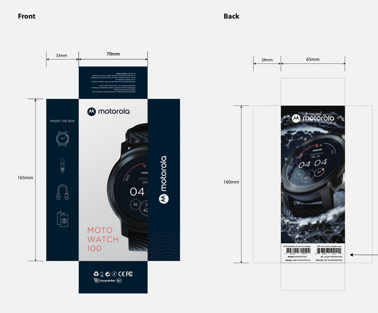 Ein Leak enthüllt bereits die Verpackung der Moto Watch 100, während die FCC-Zertifizierung bestätigt, dass die Smartwatch auf ein Aluminiumgehäuse setzt, das bis 5 ATM wasserdicht ist, also etwa bis zu einer Tiefe von 50 Metern, sodass sich die Uhr auch zum Schwimmen eignet. Das Bild der Uhr auf der Verpackung bestätigt, dass Motorola einen Herzfrequenzsensor verbaut, und dass die Smartwatch Schlaf-Tracking unterstützt. Im Lieferumfang findet sich neben der Uhr und dem Armband auch ein magnetisches Ladekabel.