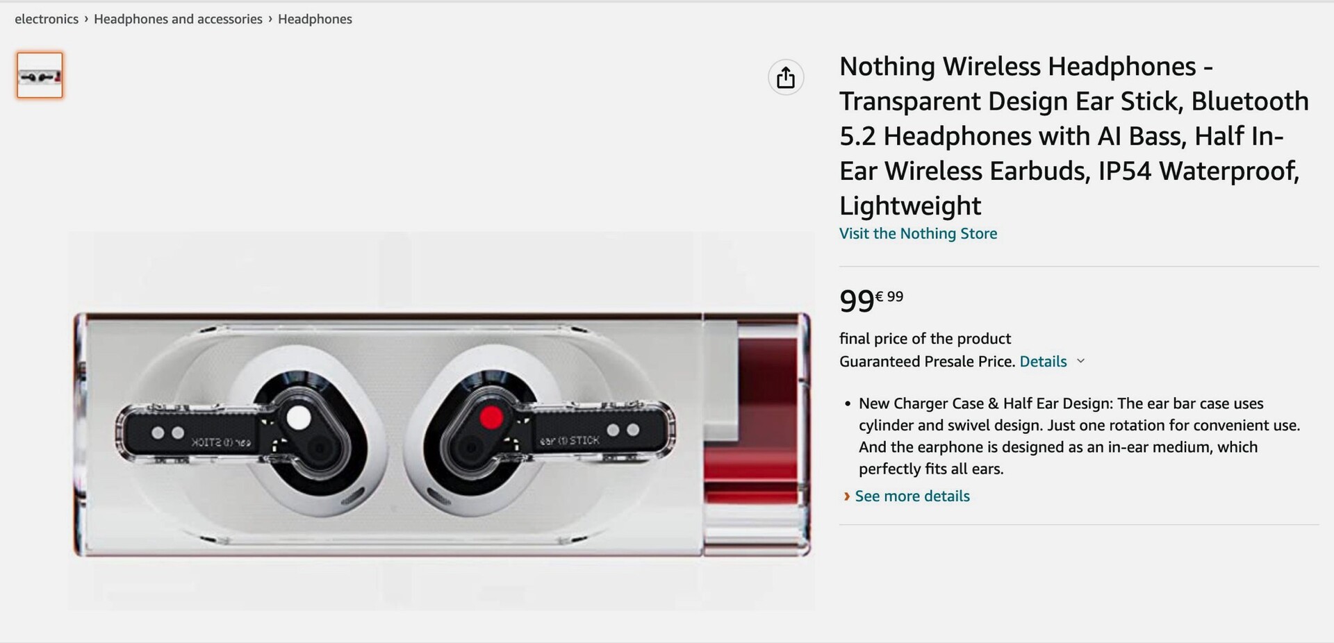 Update 11:50 Uhr: Der Leaker SnoopyTech hat mittlerweile den unten eingebetteten Screenshot geteilt, der offenbar einen Amazon-Eintrag der Nothing Ear (1) Stick zeigt. Demnach kosten die komplett drahtlosen Ohrhörer genau wie die ältere Version der Ear (1) 99 Euro, die Ohrhörer bieten Bluetooth 5.2 und eine IP54-Zertifizierung zum Schutz gegen Regen und Schweiß. Die Akkulaufzeit wird mit 7 Stunden angegeben, oder aber 30 Stunden mit der Ladehülle.