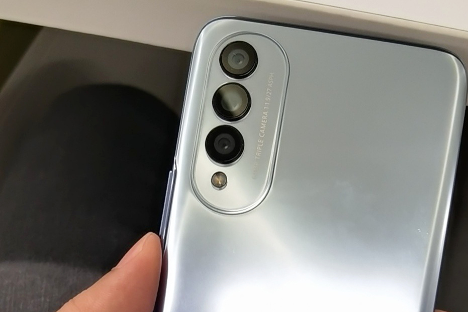 Die Rückseite ist in einem hübschen Farbverlauf ausgeführt und zu den Seiten hin abgerundet, das ungewöhnlichste Designelement des Smartphones ist aber das Kameramodul. Dieses ist nämlich oval, die drei Kameras sind aber nicht etwa mittig darin ausgerichtet, sondern an der linken oberen "Ecke" – das sieht allemal gewöhnungsbedürftig aus. Die Aufschrift bestätigt bereits, dass die Hauptkamera eine Auflösung von 64 Megapixel, eine Kleinbild-äquivalente Brennweite von 27 Millimeter und eine Blendenöffnung von f/1.9 bieten wird.