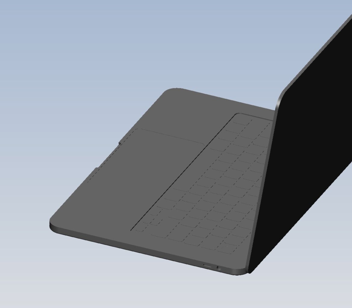 Die CAD-Dateien zeigen ein Display mit stark abgerundeten Ecken, und zwar auf allen vier Seiten, anders als beim neuen MacBook Pro, bei dem nur die oberen beiden Ecken abgerundet wurden. Die Bildschirmränder sind etwas dicker als beim MacBook Pro, dafür kann das Gerät aber auf eine Notch verzichten. Das Gehäuse ist nicht mehr keilförmig, sondern durchgehend gleich dick. Apple bietet offenbar zwei Thunderbolt-Anschlüsse (USB-C), AUX und MagSafe, HDMI und der SD-Kartenleser bleiben also dem MacBook Pro vorbehalten.