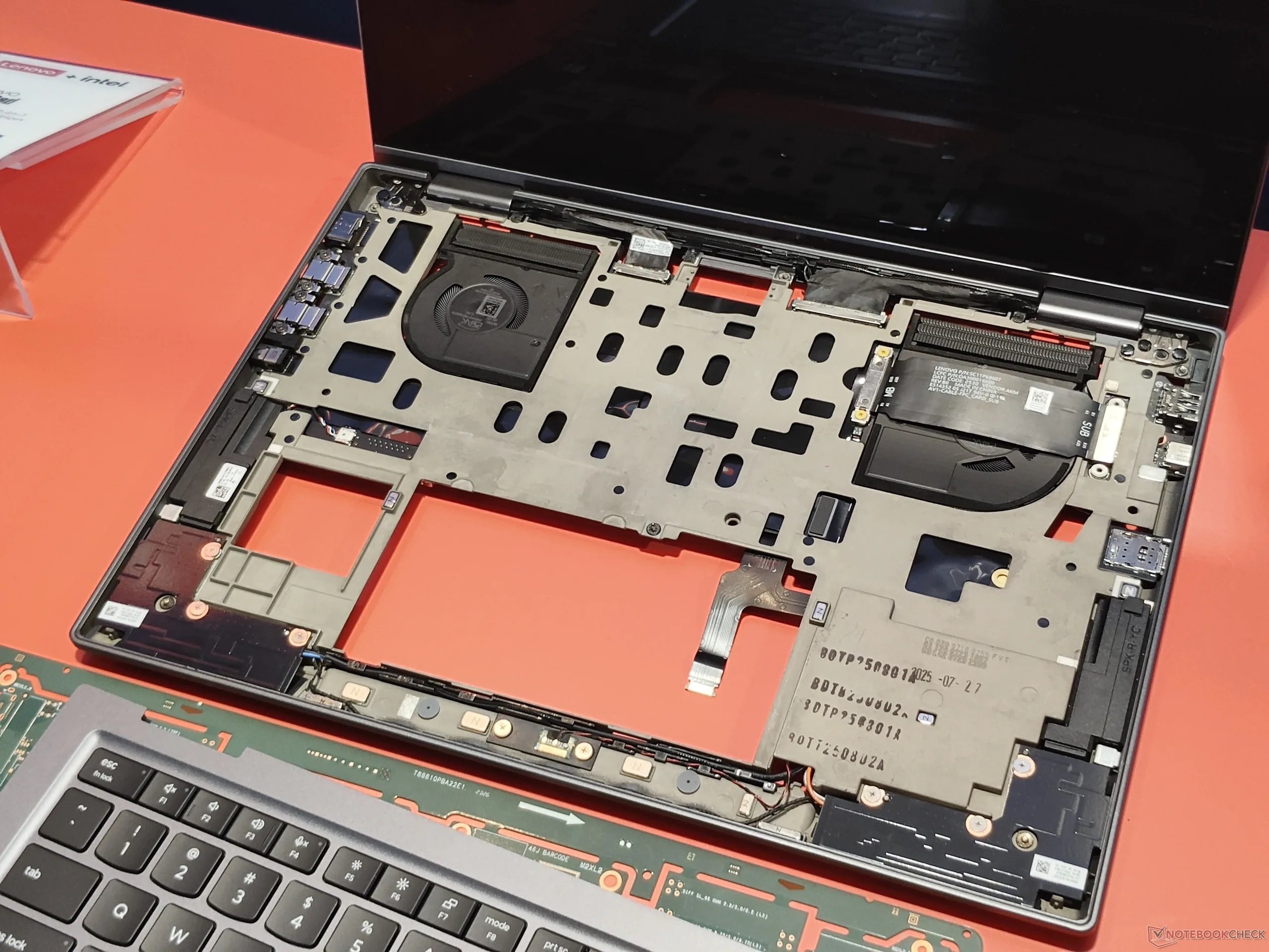 Ein weiterer Vorteil ist die bessere Ausnutzung des verfügbaren Raums, daher "Space Frame" ("Space" ist Englisch für "Raum"). Indem Lenovo einige Komponenten wie die internen Display-Anschlüsse und die Wi-Fi-Antennen auf die andere Seite des neuen Zwischenrahmens verlegt hat, konnte wertvoller Platz gewonnen werden, der für eine Vergrößerung des Kühlsystems genutzt wurde - so können unter Volllast bis zu 30 W gekühlt werden, statt nur 22,5 W wie beim vorherigen X1 Carbon Gen 13 (erhältlich auf Amazon). Dies ist besonders praktisch bei den neuen Panther Lake CPUs, da der Intel Core Ultra X7 mehr Energie benötigt, um deutlich mehr Leistung bereitzustellen als die vorherigen Lunar Lake CPUs. Außerdem konnte Lenovo mit dem neuen, kleineren Motherboard den USB C Ports modular zu gestalten und einige der anderen Ports auf ein separates Daughterboard zu verlegen.