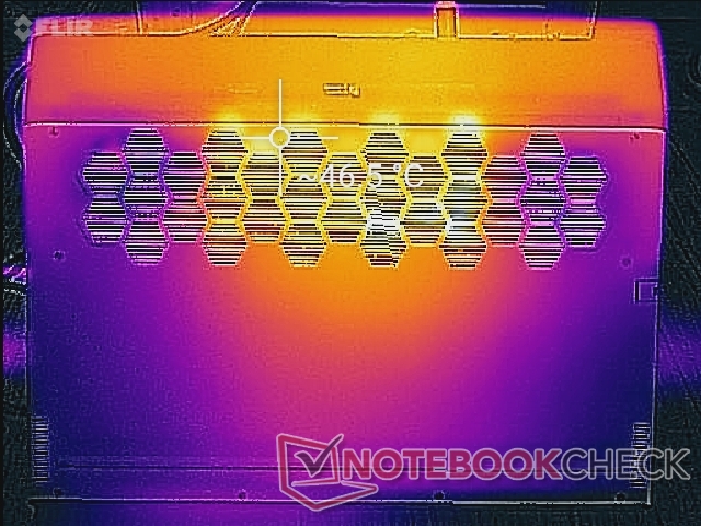 Die Oberflächentemperatur ist im Leerlauf im Quiet-Modus recht gleichmäßig. Die wärmeren Bereiche befinden sich wie erwartet weiter hinten. Läuft das Gerät im ausgeglichenen Modus im Leerlauf, ist die Oberflächentemperatur vermutlich geringer, da die Lüfter hier aktiver sind.