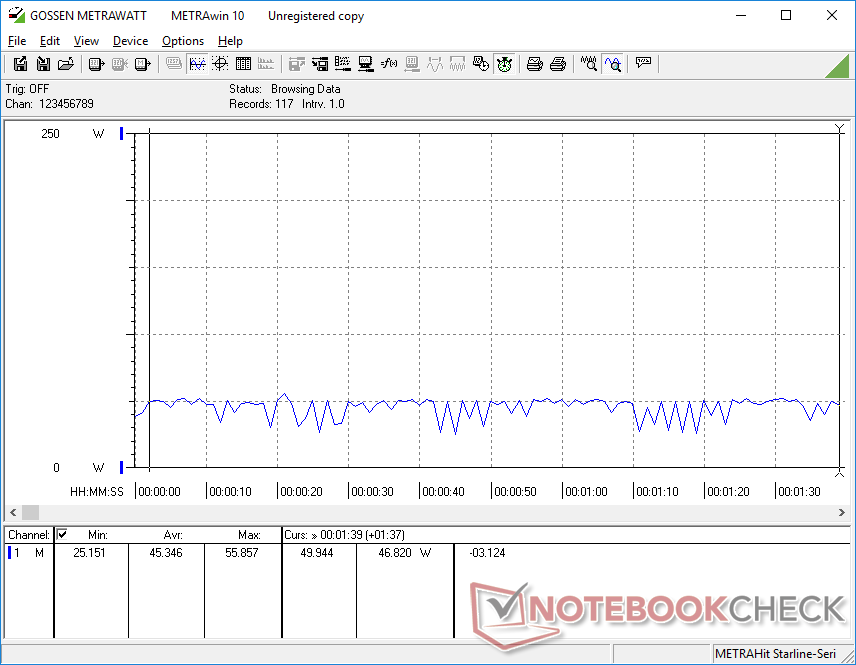 Im Leerlauf kann die Energieaufnahme je nach Helligkeit und Leistungseinstellung zwischen 19 und 52 Wh reichen. Selbst im Quiet-Modus kommt es immer wieder zu unerklärlichen Anstiegen im Energieverbrauch; Dell sollte möglicherweise daran arbeiten, die Hintergrundaktivitäten im Energiesparmodus zu verringern. Die meisten anderen 15,6-Zoll-Gamer sind effizienter und nehmen im Leerlauf nur zwischen 20 und 30 W auf.