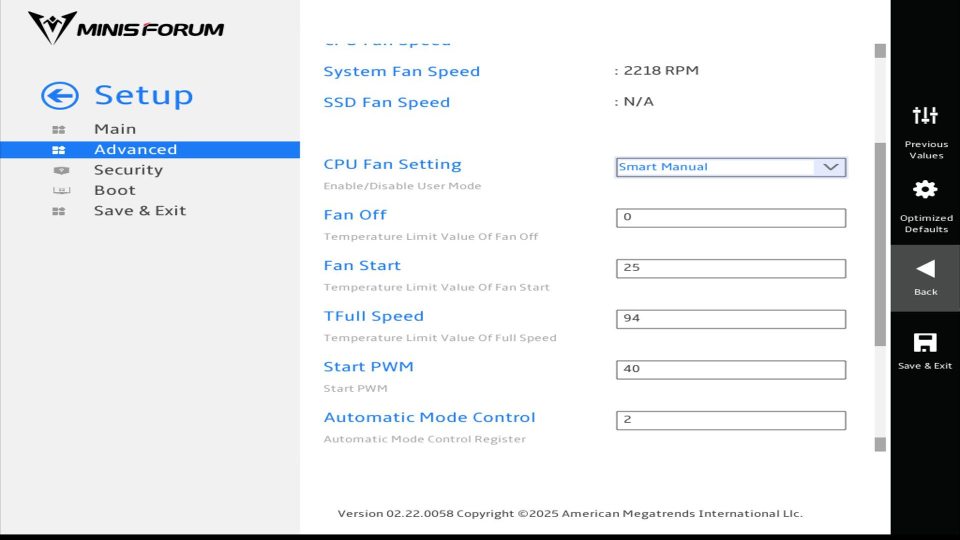 In unseren Messungen ist der Minisforum MS-S1 Max unter Volllast hörbar, im Leerlauf jedoch problematisch laut (46 dB(A)), was eine massive Abwertung der Gesamtwertung zur Folge hat. Ein thermisches Problem kann jedoch ausgeschlossen werden. Minisforum haben wir vor Veröffentlichung des Tests in Kenntnis gesetzt. Schlussendlich arbeitet das System so, wie es soll. Das UEFI bietet mehr Möglichkeiten als beim Bosgame M5 oder dem GMKtec EVO‑X2, um manuelle Anpassungen vorzunehmen. Mit einer manuell festgesetzten Lüftergeschwindigkeit von 50 Prozent sinkt der Schalldruckpegel auf 38,5 dB(A).