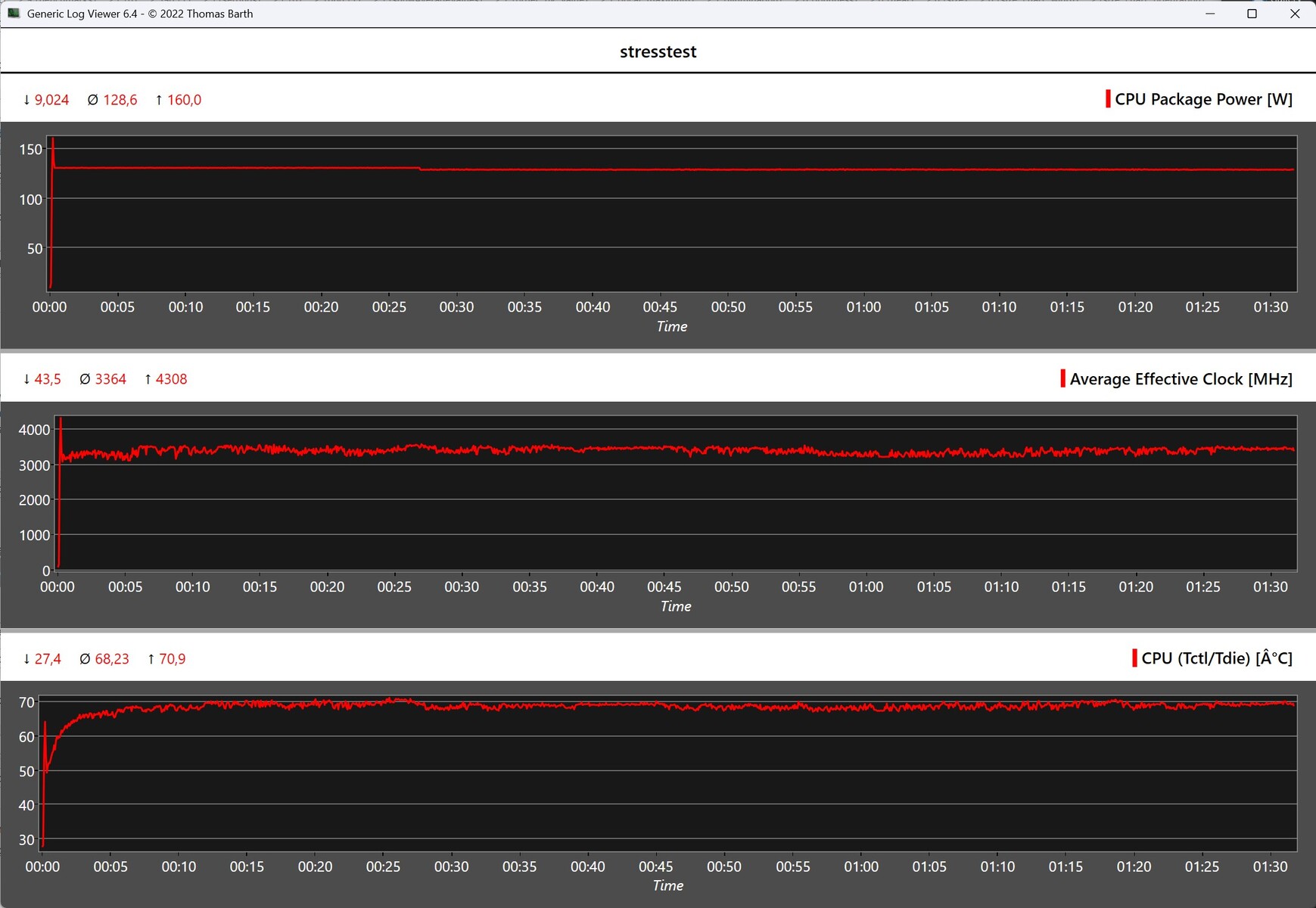 (+) Ohne Last messen wir eine durchschnittliche Temperatur von 27 °C auf der Oberseite. Der Klassendurchschnitt erreicht 32.4 °C.