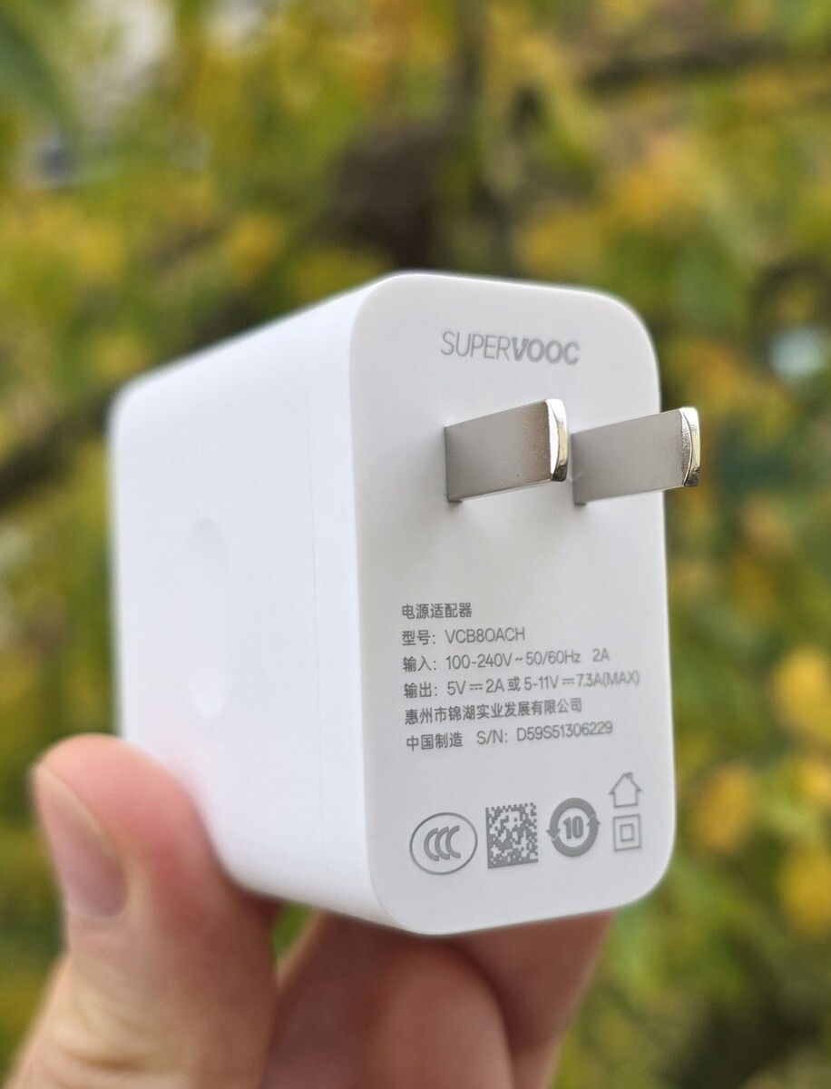 Das zum Lieferumfang gehörende Super-VOOC-Charger lädt das Flagship-Smartphone mit 80 Watt in der Spitze (11V, 7,3A) und bringt nur etwa 106 Gramm auf die Waage. Etwas zu „traditionell“ zeigt sich Oppo allerdings beim USB-Anschluss. Hier setzt der Hersteller nur auf Type-A, sodass logischerweise auch das mitgelieferte USB-Kabel lediglich einen Type-A-Anschluss besitzt und nicht den moderneren USB-C-auf USB-C-Stecker. Da immer weniger Laptops auf diesen alten Standard setzen, wäre es an der Zeit, dass Oppo seinen Netzteilen ein Update spendiert.