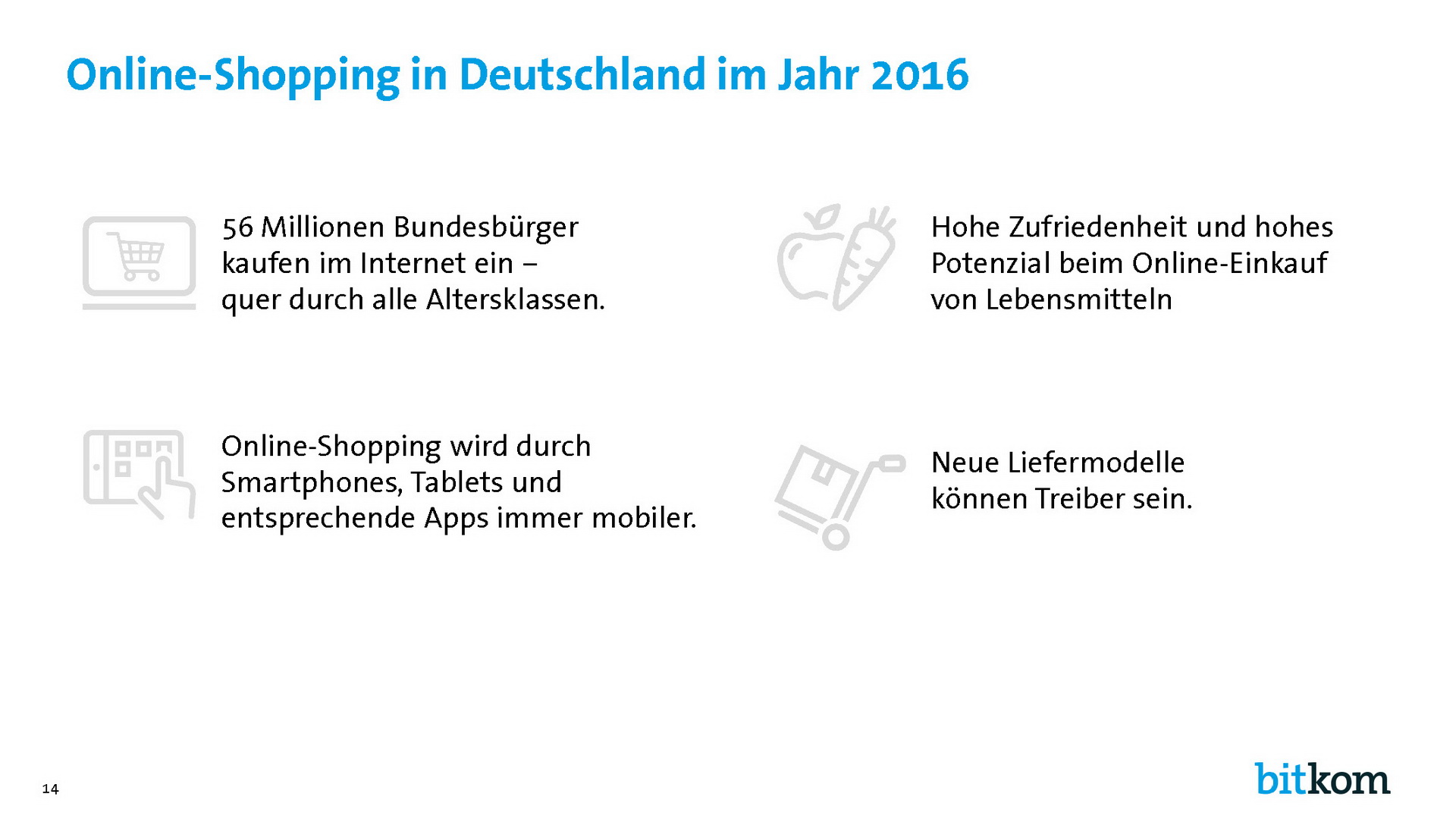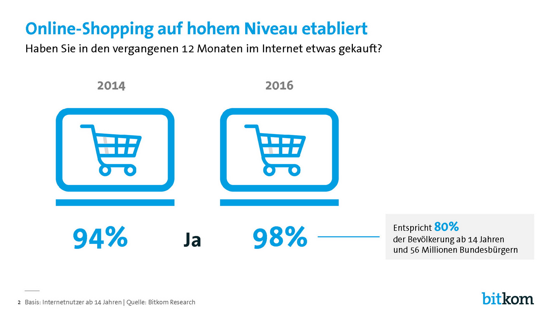 So verwenden heute auf dem Smartphone schon knapp 68 Prozent Apps zum Einkauf, bei den Tablets ist es mit 51 Prozent gut die Hälfte. Gemäß dem Bitkom haben 98 Prozent (!) aller Internetnutzer ab 14 Jahren in den vergangenen 12 Monaten online etwas gekauft: Onlineshopping wird vom Einzel- zum Regelfall. Vier Prozent kaufen täglich, jeweils 14 Prozent shoppt einmal oder mehrmals pro Woche online und knapp die Hälfte (47 Prozent) mehrmals pro Monat.