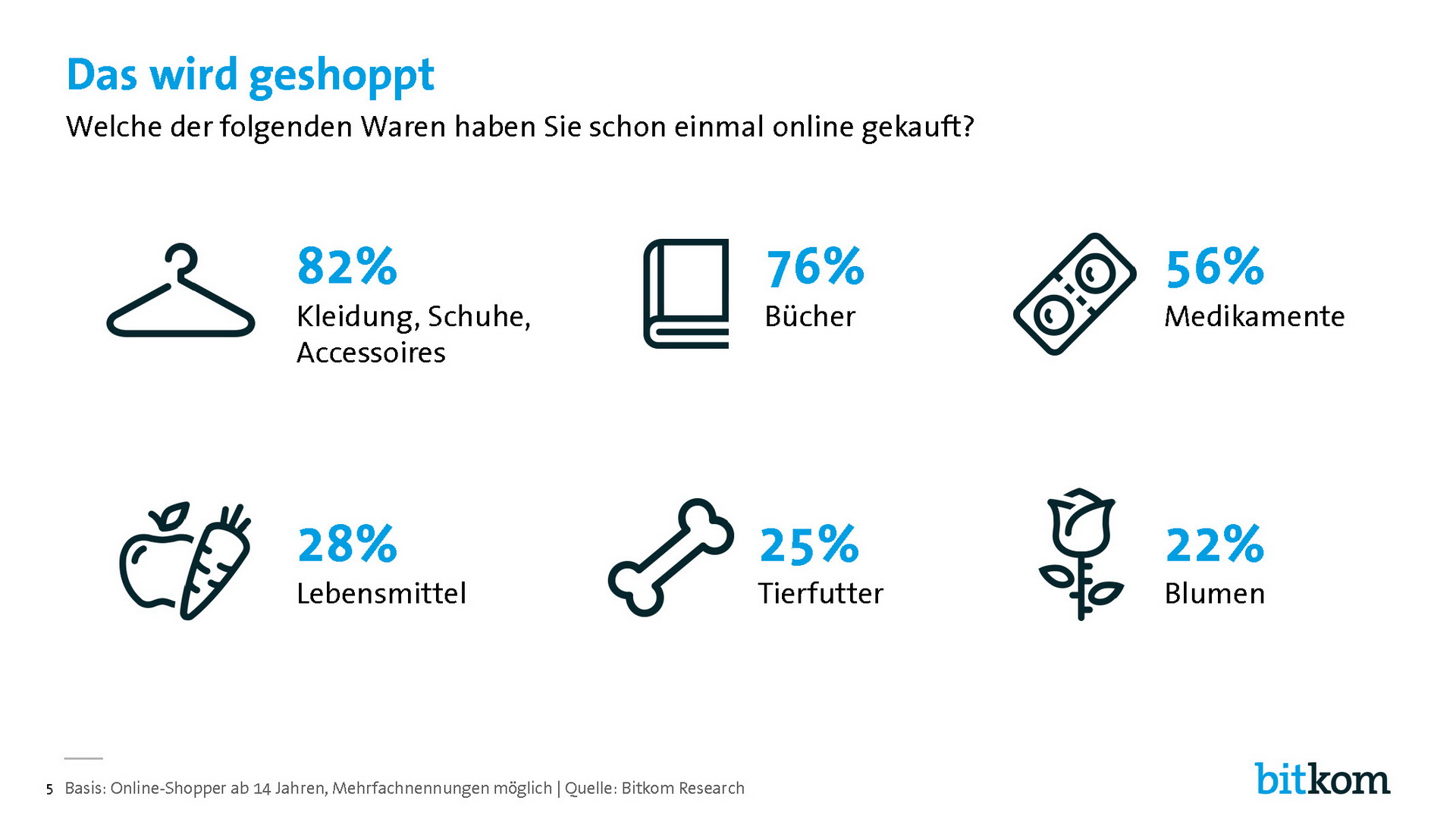 Ganz vorne in der Käufergunst rangieren Kleidung (82 Prozent) und Bücher (76 Prozent). Pharmaprodukte haben 56 Prozent aller Online-Shoppenden online gekauft, in der Gruppe der ab 65-Jährigen sind es sogar 65 Prozent. Gerne über das Internet werden auch elektronische Haushaltsgeräte (59 Prozent), Heimwerkerbedarf (38 Prozent), Kosmetik (55 Prozent) oder Tierfutter (25 Prozent) gekauft.
