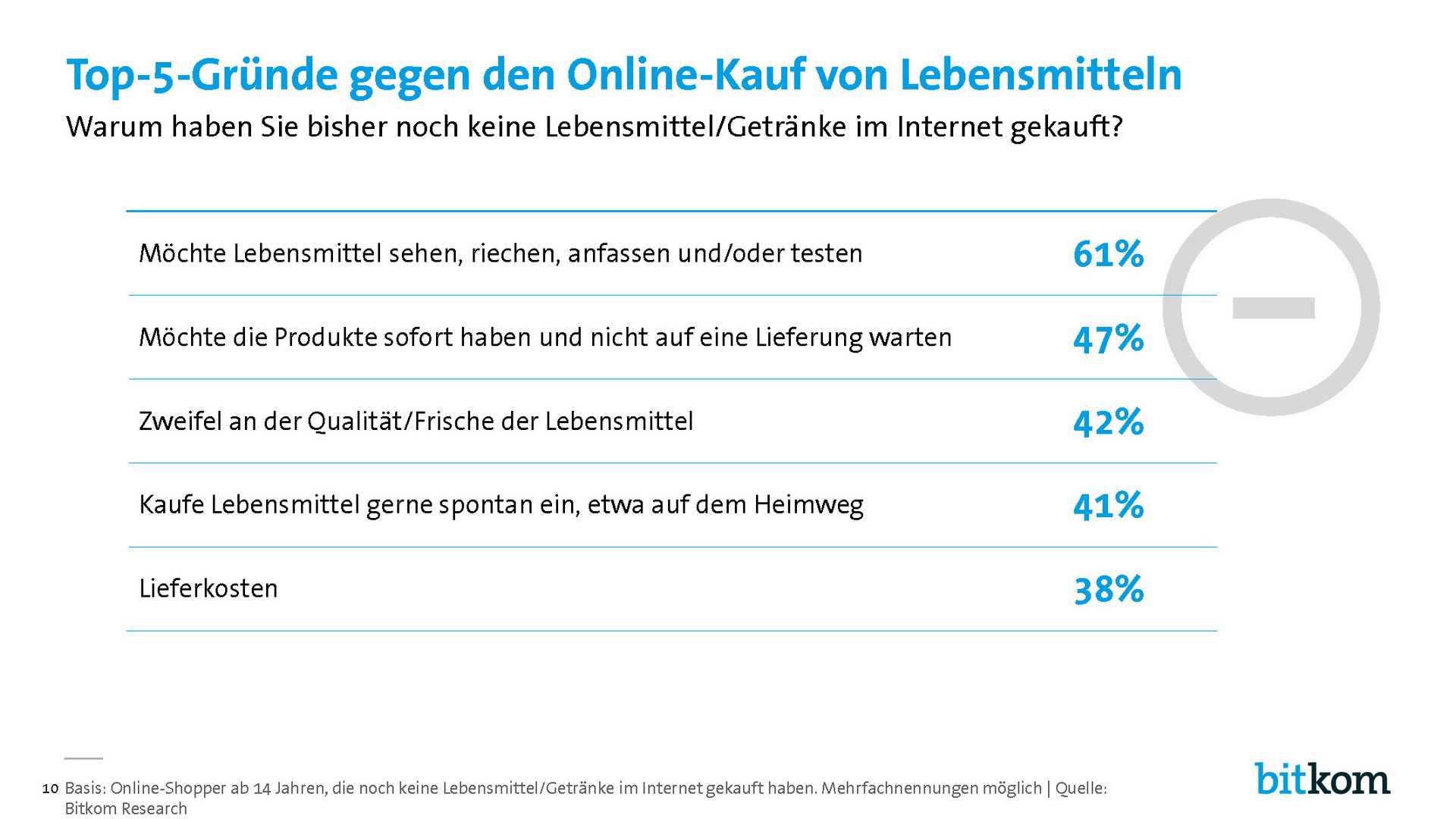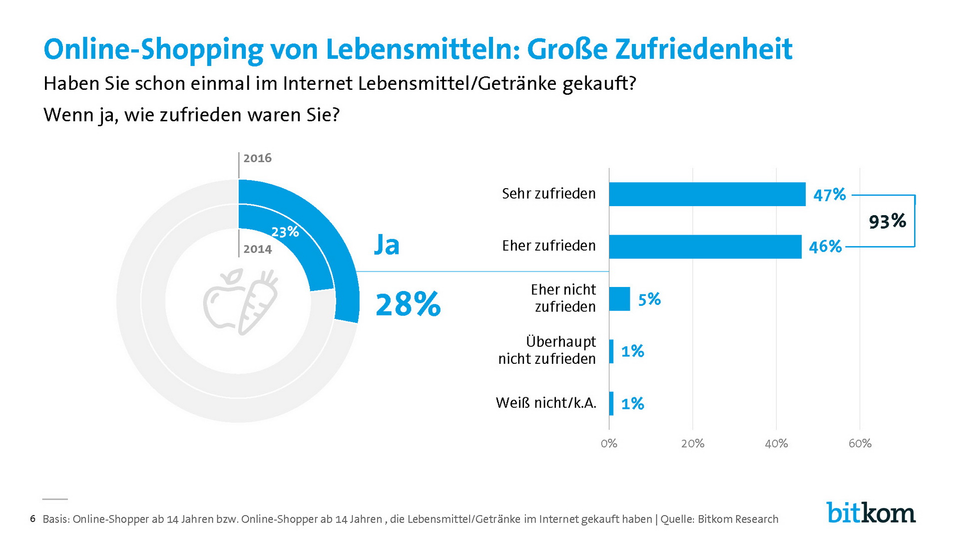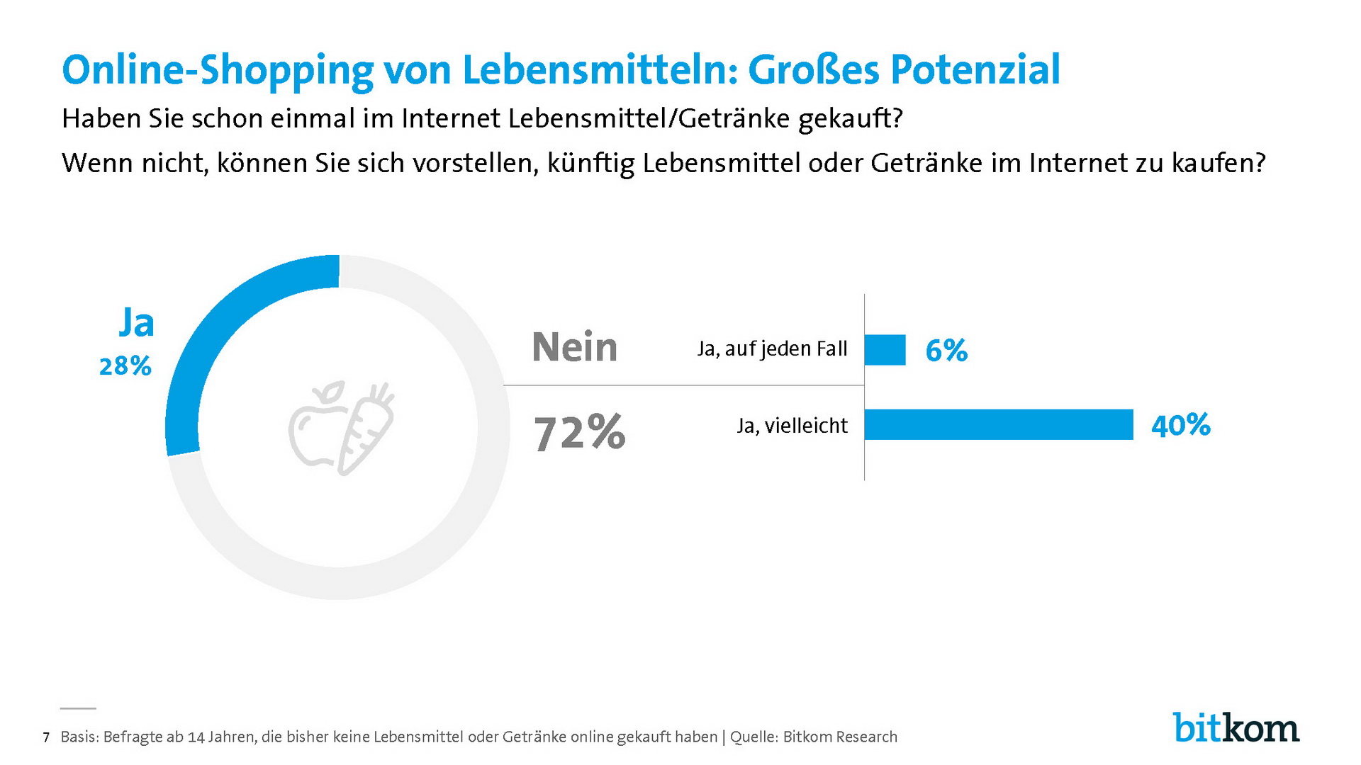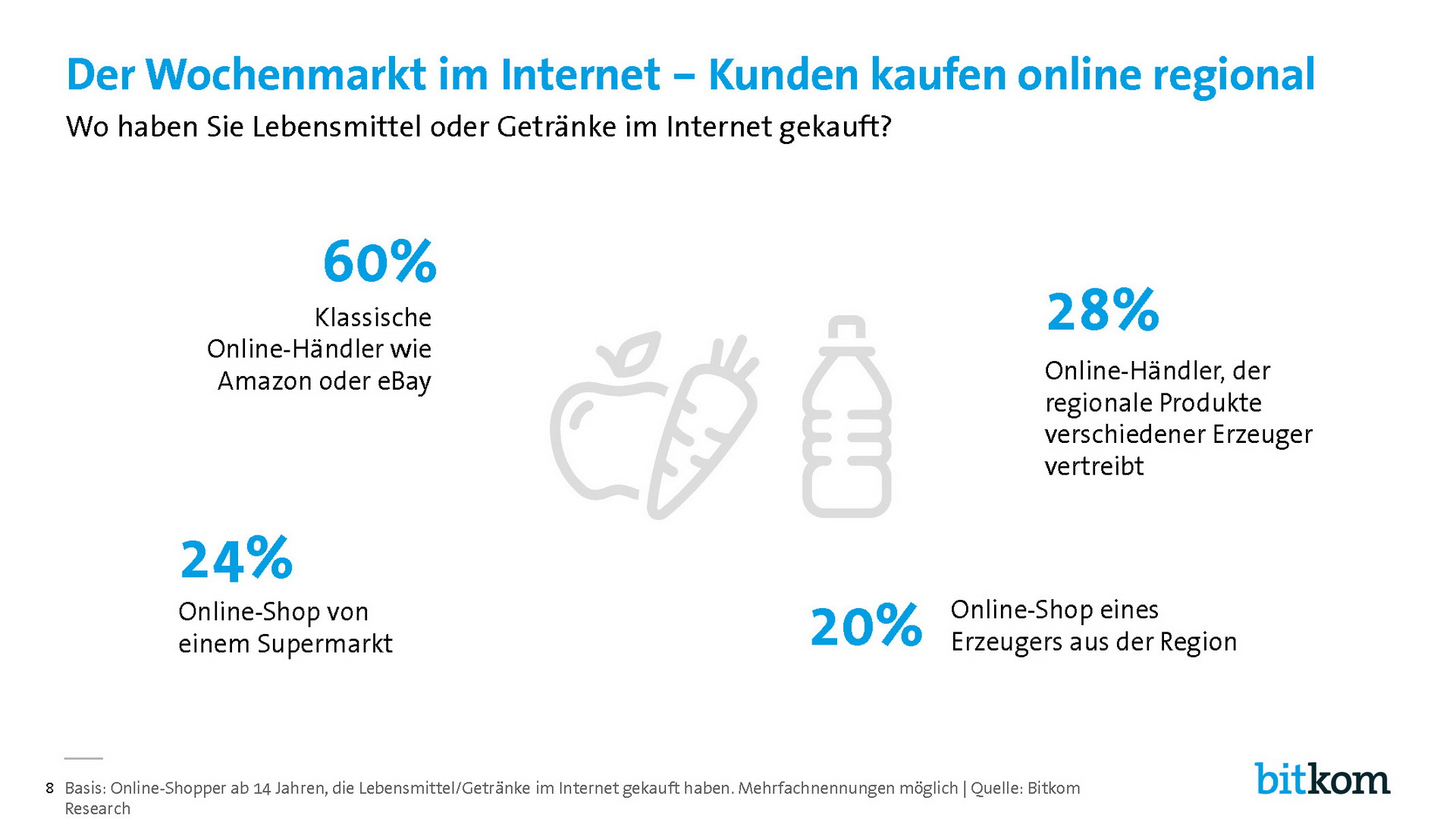Und sogar Lebensmittel, die lange Zeit als letzte Bastion des stationären Handels galten, haben gemäß der Umfrage mittlerweile mehr als ein Viertel der Onlineshopper (28 Prozent) im Internet bestellt. Bei der Frage, wo Lebensmittel oder Getränke im Internet gekauft werden, liegen zwar wenig überraschend klassische Onlinehändler wie Amazon mit 60 Prozent ganz vorne. Bereits auf Platz zwei (28 Prozent) rangieren aber Onlineanbieter, die regionale Produkte verschiedener Erzeuger vertreiben. 20 Prozent, die Lebensmittel online kaufen, shoppen im Onlineshop eines Erzeugers aus der Region.