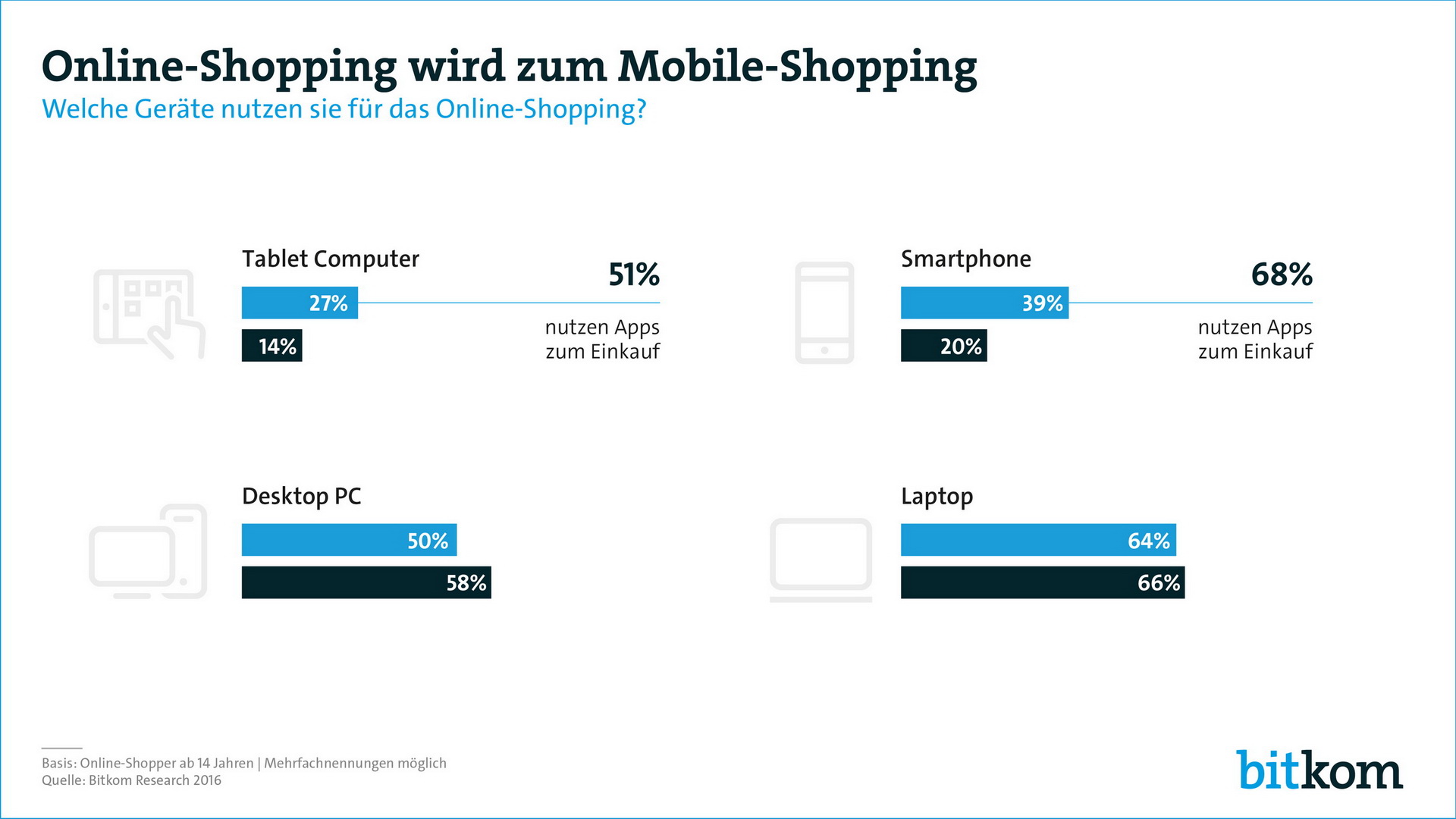 27 Prozent kaufen Online über das Tablet Produkte, Dienstleistungen oder digitalen Content wie beispielsweise Filme ein. Einkäufe über den klassischen PC sind laut dem Bitkom zwar rückläufig, allerdings shoppen 64 Prozent noch via Laptop und 50 Prozent nutzen den Desktop-PC.