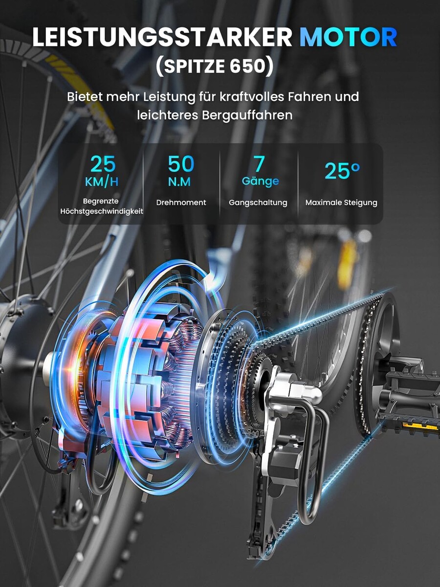 Beworben wird vom Herstellern das Vorhandensein von hydraulisch und nicht mechanisch agierenden Scheibenbremsen, hydraulische Scheibenbremsen gelten im Allgemeinen als technologisch überlegen, allerdings erfordert die Wartung spezialisiertes - wenn auch etwa bei Amazon günstig erhältliches - Werkzeug. Gesteuert wird über einen Trittfrequenz- und nicht einen Drehmomentsensor, was einer reaktiven und dynamischen Unterstützung nicht zuträglich ein dürfte. Verbaut ist eine Kettenschaltung von Shimano. Vorne und hinten kommen 29 Zoll große und 2,4 Zoll breite Reifen zum Einsatz. Das 2,6 Zoll große LC-Display kann etwa über die noch verbleibende Akkukapazität informieren.