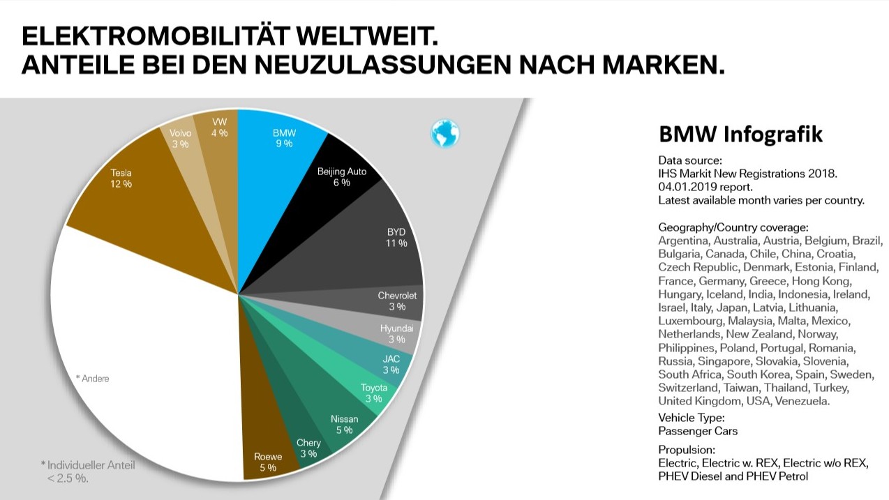 Für BMW war Europa mit über 50 Prozent der Verkäufe in 2018 die wichtigste Vertriebsregion des Unternehmens für elektrifizierte Fahrzeuge. Mit insgesamt 75.000 ausgelieferten E-Fahrzeugen und einem Marktanteil von über 16 Prozent im vergangenen Jahr ist der Autohersteller BMW klarer Marktführer in Europa. In Deutschland stammte jedes fünfte Elektrofahrzeug von BMW.