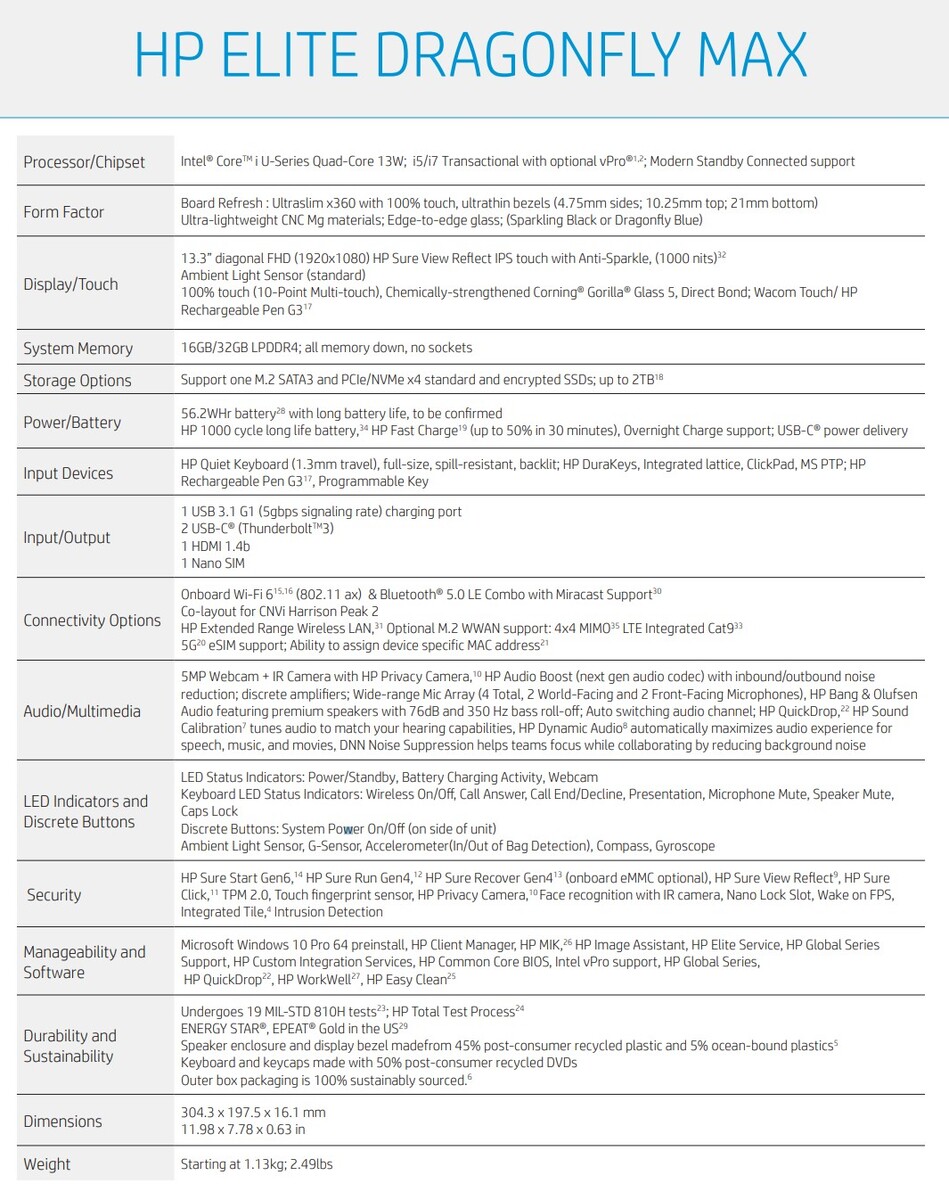 Sowohl das Elite Dragonfly Max als auch das Dragonfly G2 sind sehr leichte 13,3 Zoll Business-Convertibles mit Magnesium-Chassis und Intel Tiger Lake vPro-Chip und als solche wohl nicht gerade günstig, die Max-Version will sich auch durch seine 4 Mikros für bessere Audioqualität bei Videochats vom Dragonfly G2 absetzen und insbesondere jene ansprechen, die online professionell mit anderen kommunizieren wollen. Das 1,1 kg leichte Convertible wird es - zumindest im US-Markt - noch im Januar 2021 in Schwarz und Dunkelblau geben, einen Preis oder Verfügbarkeit in Europa hat HP noch nicht genannt.