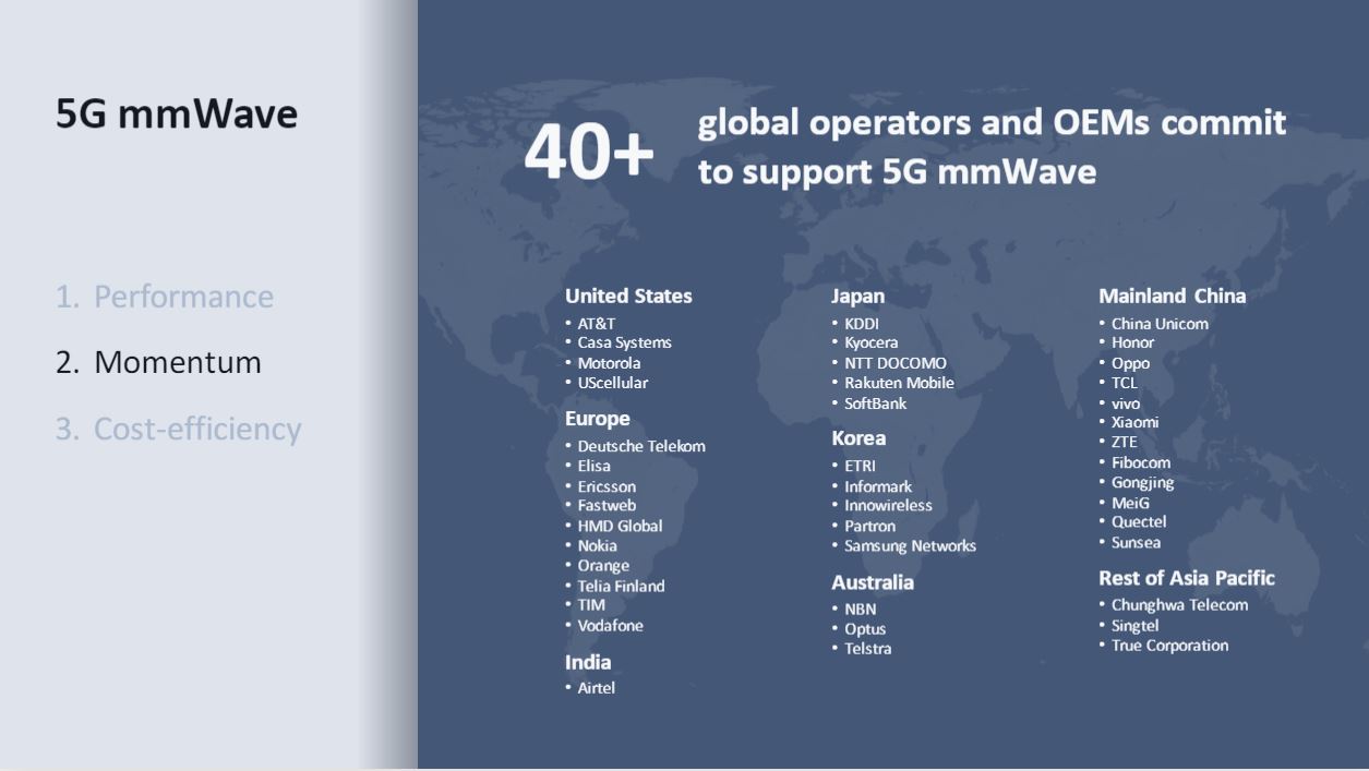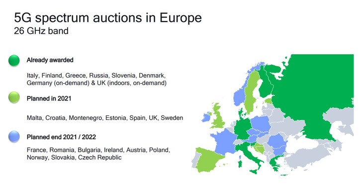 Laut Qualcomm planen derzeit mehr als 40 Mobilfunkprovider und OEMs weltweit mmWave-Unterstützung, konkret in den USA, Europa, Indien, Japan, Korea, Australien, China und weiteren Regionen in Asien. Als einziges Land in der EU hat Italien bereits seit Dezember 2020 ein schnelles mmWave-Netz in Betrieb und zwar Fastweb mit Geschwindigkeiten bis zu 1 Gb/s. Italien, Finnland, Griechenland, Russland, Slowenien und Dänemark haben im Zuge von Auktionen bereits 5G-Frequenzspektren im 26 Ghz-Band versteigert, in Deutschland und dem Vereinten Königreich zumindest eingeschränkt.
