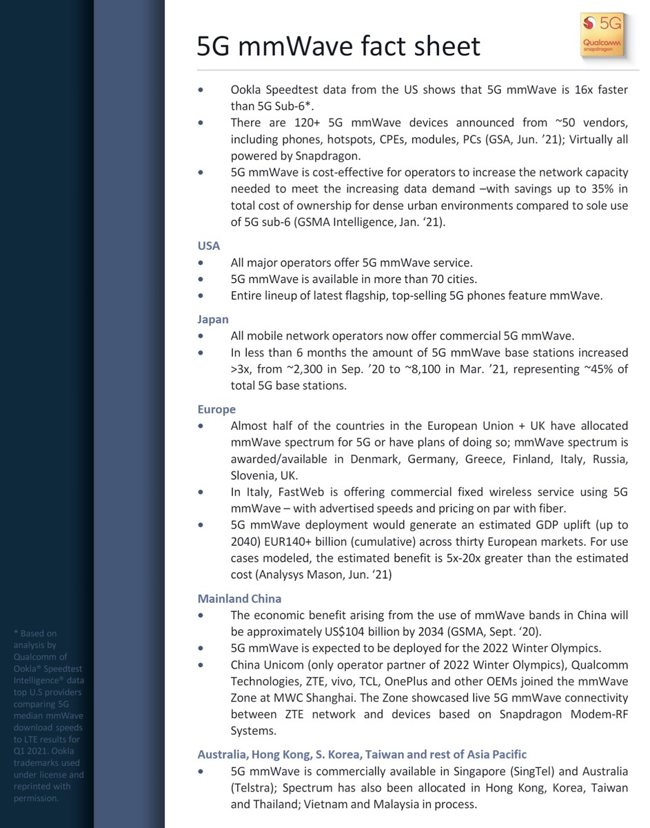 In 2021 sollen Malta, Kroatien, Montenegro, Estland, Spanien, Schweden und das Vereinte Königreich dazu stoßen, für Ende 2021 und das Jahr 2022 sind dann auch in Frankreich, Rumänien, Bulgarien, Irland, Polen, Österreich, Norwegen, der Slowakei und Tschechien Frequenzauktionen im mmWave-Bereich geplant. Bleibt die Frage wer die nutzen kann. Wie wir in der Vergangenheit immer wieder kritisiert haben, liefern Smartphone-Hersteller in Europa auch 2021 noch mmWave-lose 5G-Flaggschiffe aus - die benötigten mmWave-Antennen fehlen durch die Bank und sind nur in den für die USA geplanten Modellen zu finden. Qualcomms Angabe von 120+ mmWave-Geräten auf Snapdragon-Basis am Markt ist also vielleicht für die USA korrekt, nicht aber für den Rest der Welt.