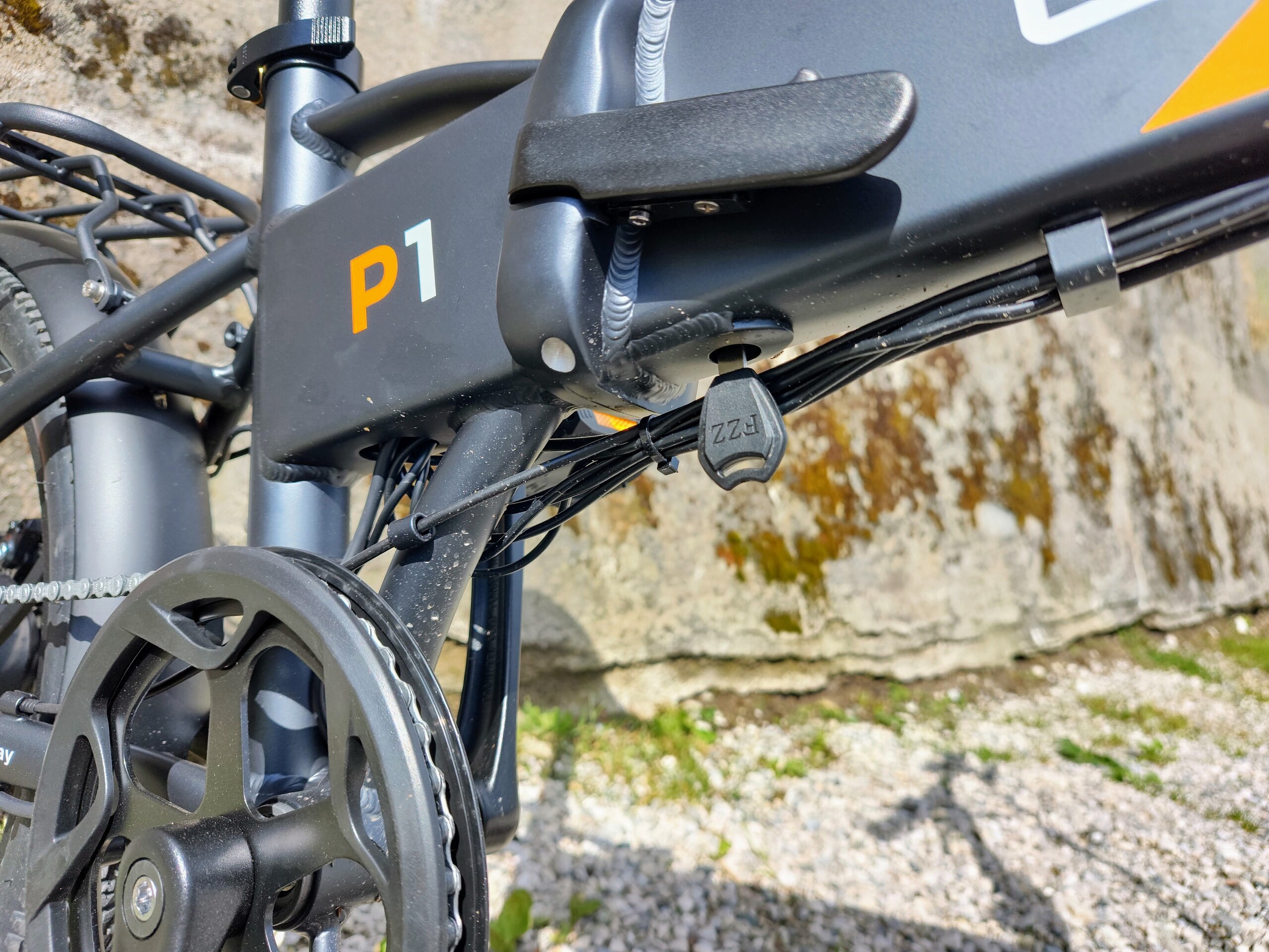 Das Zusammenklappen des Rades gelingt auf Anhieb. Das eingeklappte P1 passt sogar in den Kofferraum eines Kleinstwagens, etwa einen Fiat Panda. Alle Klappverschlüsse sind gegen versehentliche Bedienung gesichert. Satteltaschen können problemlos genutzt werden. Die stören weder am Schaltwerk, noch kommen sie mit den Schuhen in Berührung.
