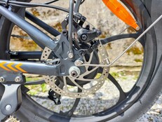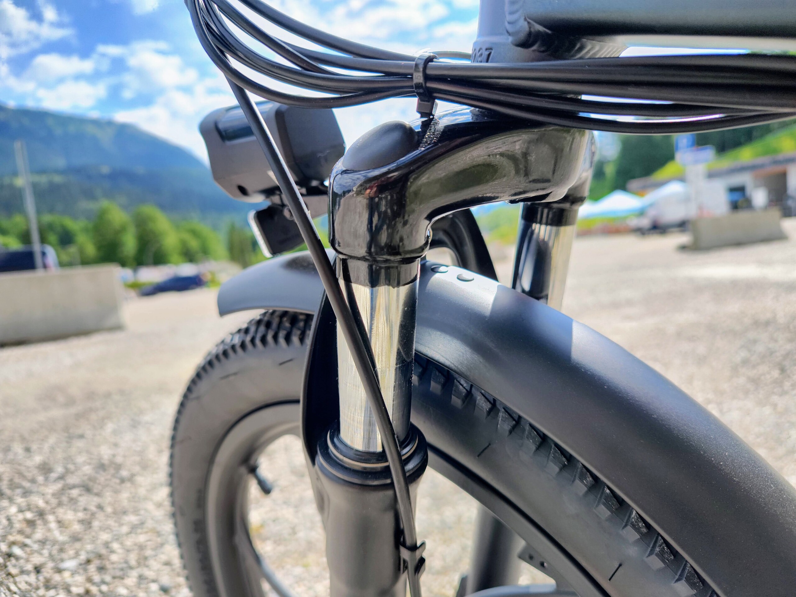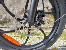 Positiv überrascht uns die Rahmensteifigkeit. Auch bei einem Tempo von 40 km/h und mehr bleibt das Engwe P1 stabil. Es folgt Radien zuverlässig und vermittelt Sicherheit. Auch freihändiges Fahren ist ohne Lenkerschlagen möglich. Die Gabel ist dagegen unbrauchbar. Sie ist derart weich abgestimmt, dass sie im Stehen problemlos zum Durchschlagen gebracht werden kann. Die mindere Qualität wird dabei selbst an der Lackierung deutlich, das Schwarz der Gabelbrücke zieht sich bis auf die Tauchrohre.