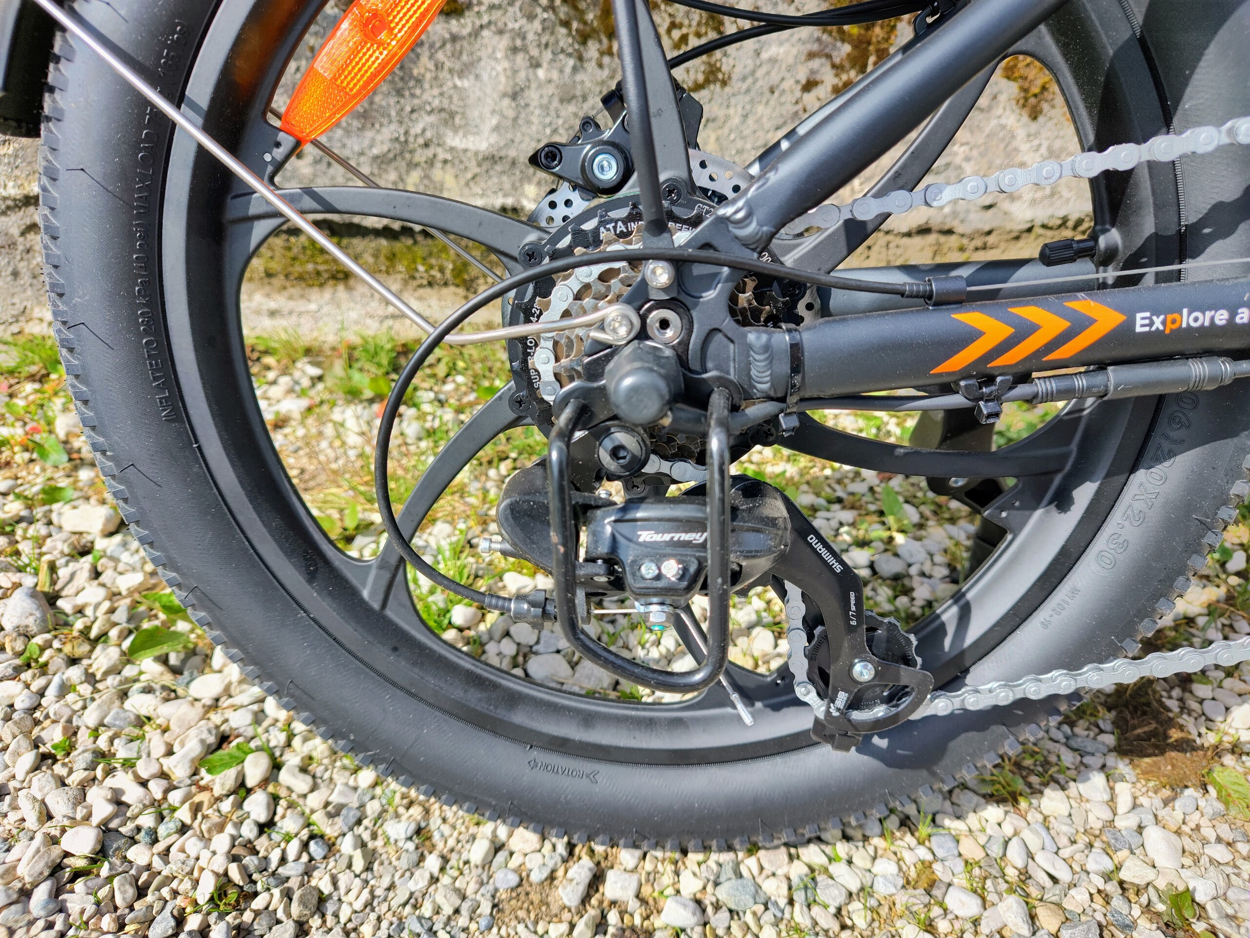 Die Abstimmung des Hecknabenmotors ist sehr gut gelungen. Obwohl das Engwe P1 ohne Drehmomentsensor auskommen muss, gelingt das Zusammenspiel zwischen Motor- und Muskelkraft angenehm harmonisch. Die fünf Unterstützungsstufen des Motors haben keinen Einfluss auf die Charakteristik oder das Drehmoment des Antriebs. Er arbeitet stets mit der größten Kraft von maximal 40 Nm. Die Stufen verändern lediglich die maximale Geschwindigkeit, bis zu der der Motor anschiebt.
