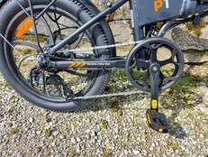 Sieben Gänge sind hingegen nicht ungewöhnlich an einem Klapprad. Schaltwerk und Trigger kommen von Shimano. Die Tourney-Serie ist allerdings schon betagt und im Einstiegsbereich anzusiedeln. Bei einem Klapprad steht natürlich auch die Klappfunktion im Fokus. Das P1 klappt etwa mittig im Hauptrahmen. Außerdem kann das Lenkrohr oberhalb des Lenkkopfs abgeklappt werden. Klapppedale sorgen zusätzlich für eine schlanke Linie.