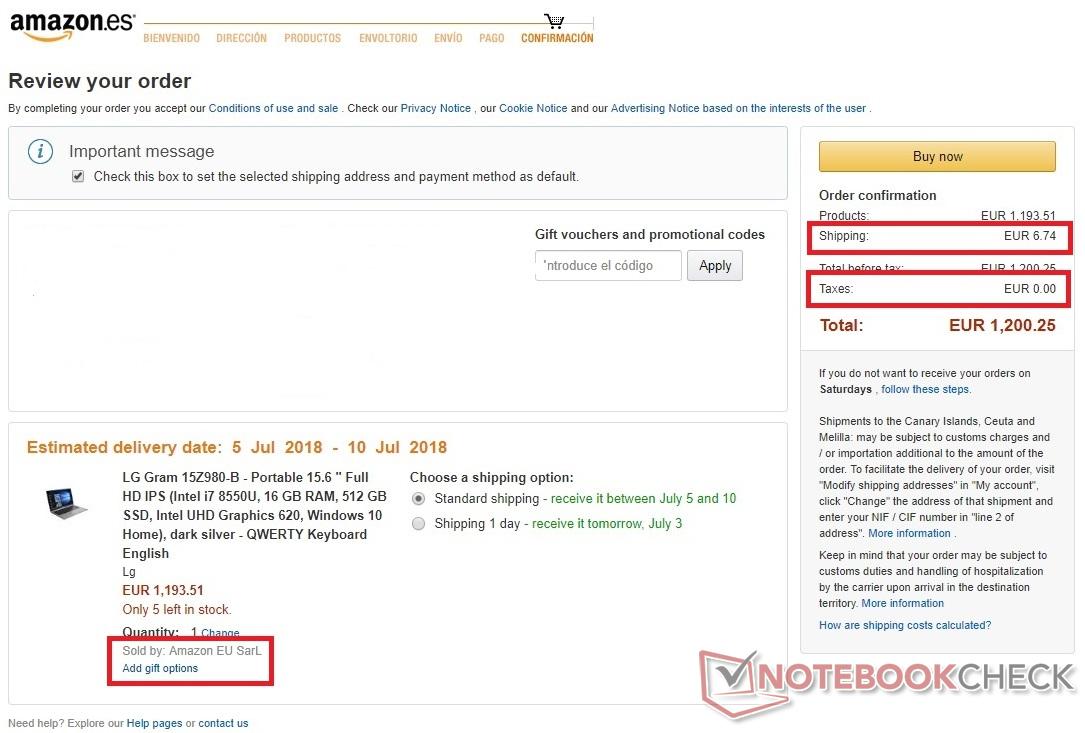 Wenn man über Amazon Spanien bestellt, muss man 6,95 Euro Versand bezahlen, ein kleiner Unterschied im Vergleich zur Bestellung bei Amazon.de. Auch bei einer Rücksendung im Falle eines Defekts muss man die Versandkosten erstmal vorstrecken, bekommt sie allerdings problemlos rückerstattet und zwar auch inklusive Versicherung. Sogar das hierzu benötigte Siegelband hat Amazon anstandslos rückerstattet, überhaupt kann ich sowohl über den spanischen LG-Support als auch den spanischen Amazon-Support nur Positives berichten.