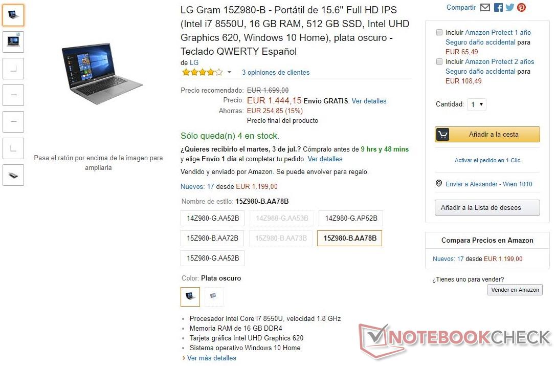 Nachdem Amazon.es das LG Gram in der neuen Version seit Kurzem nun auch im Programm hat und verglichen mit Importhändlern günstig verkauft (wenn man bei Amazon seine eventuell vorhandene VAT-Nummer hinterlegt sogar ohne Mehrwertsteuer), fiel die Wahl also auf das dort gelistete Top-Modell 15Z980 mit 15,6 Zoll-Display, Core i7-Prozessor, 16 GB RAM sowie 512 GB SATA-SSD. Wichtig: Die ebenfalls verfügbaren 14 und 13 Zoll-Versionen bieten kein Thunderbolt 3, zudem hat keines der spanischen Modelle einen Touchscreen – das ist bei den US-Modellen anders. Dort liegt zudem ein USB-auf-RJ45-Adapter bei, der den spanischen Varianten fehlt.